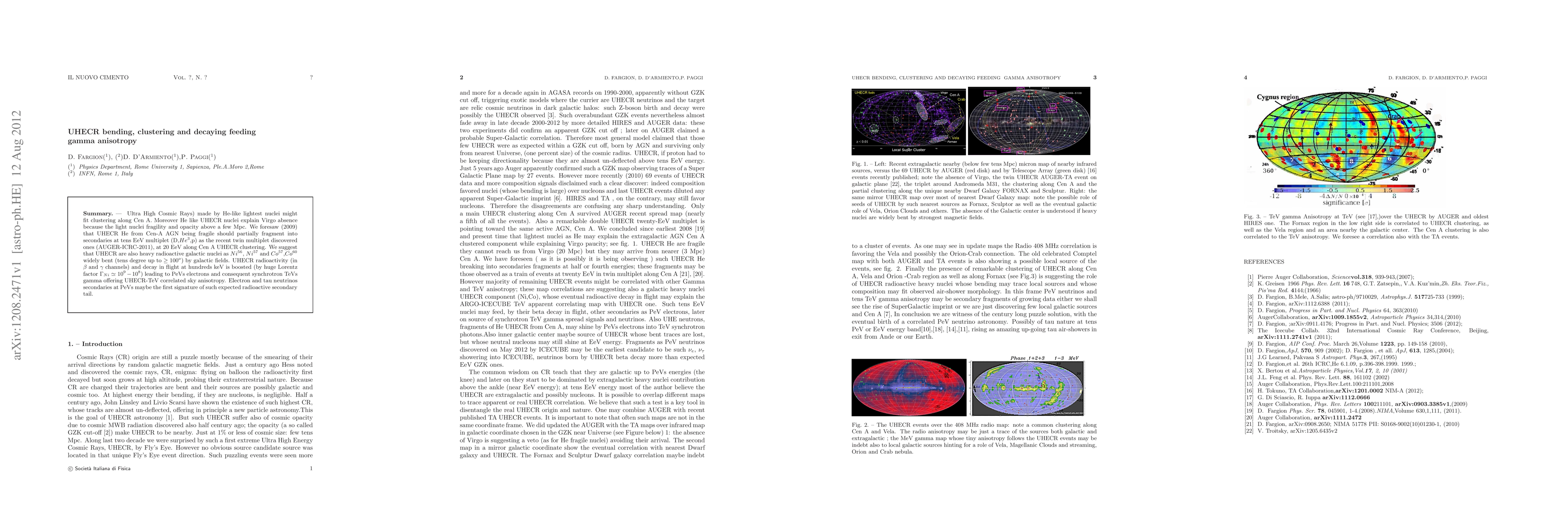 Ultra High Cosmic Rays) made by He-like lightest nuclei might fit clustering along Cen A. Moreover He like UHECR nuclei explain Virgo absence because the light nuclei fragility and opacity above a few Mpc. We foresaw (2009) that UHECR He from Cen-A AGN being fragile should partially fragment into secondaries at tens EeV multiplet (D,He^{3},p) as the recent twin multiplet discovered ones (AUGER-ICRC-2011), at 20 EeV along Cen A UHECR clustering. We suggest that UHECR are also heavy radioactive galactic nuclei as Ni^{56}, Ni^{57} and Co^{57} widely bent (tens degree up to 100 degrees) by galactic fields. UHECR radioactivity and decay in flight at hundreds keV is boosted (by huge Lorentz factor (billion) leading to PeVs electrons and consequent synchrotron TeVs gamma offering UHECR-TeV correlated sky anisotropy. Electron and tau neutrinos secondaries at PeVs maybe the first signature of such expected radioactive secondary tail.