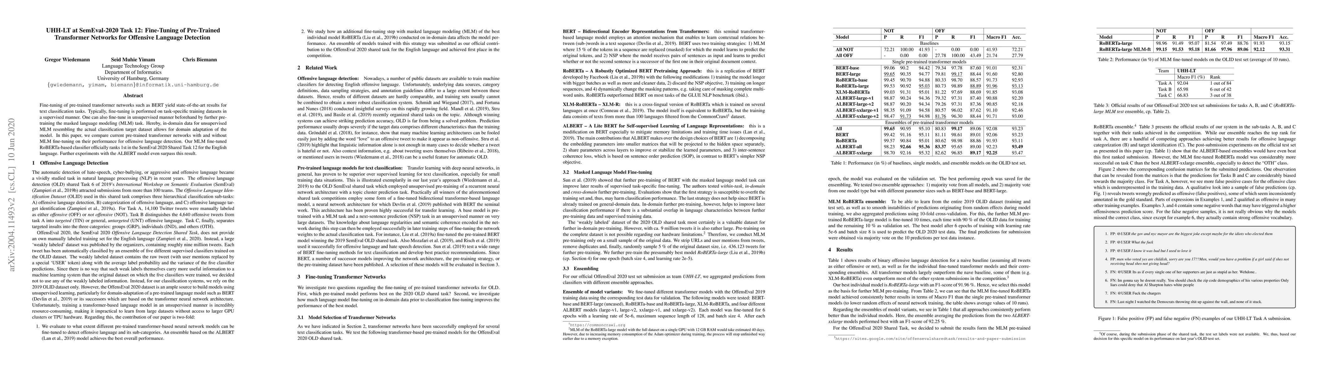 Fine-tuning of pre-trained transformer networks such as BERT yield state-of-the-art results for text classification tasks. Typically, fine-tuning is performed on task-specific training datasets in a supervised manner. One can also fine-tune in unsupervised manner beforehand by further pre-training the masked language modeling (MLM) task. Hereby, in-domain data for unsupervised MLM resembling the actual classification target dataset allows for domain adaptation of the model. In this paper, we compare current pre-trained transformer networks with and without MLM fine-tuning on their performance for offensive language detection. Our MLM fine-tuned RoBERTa-based classifier officially ranks 1st in the SemEval 2020 Shared Task~12 for the English language. Further experiments with the ALBERT model even surpass this result.