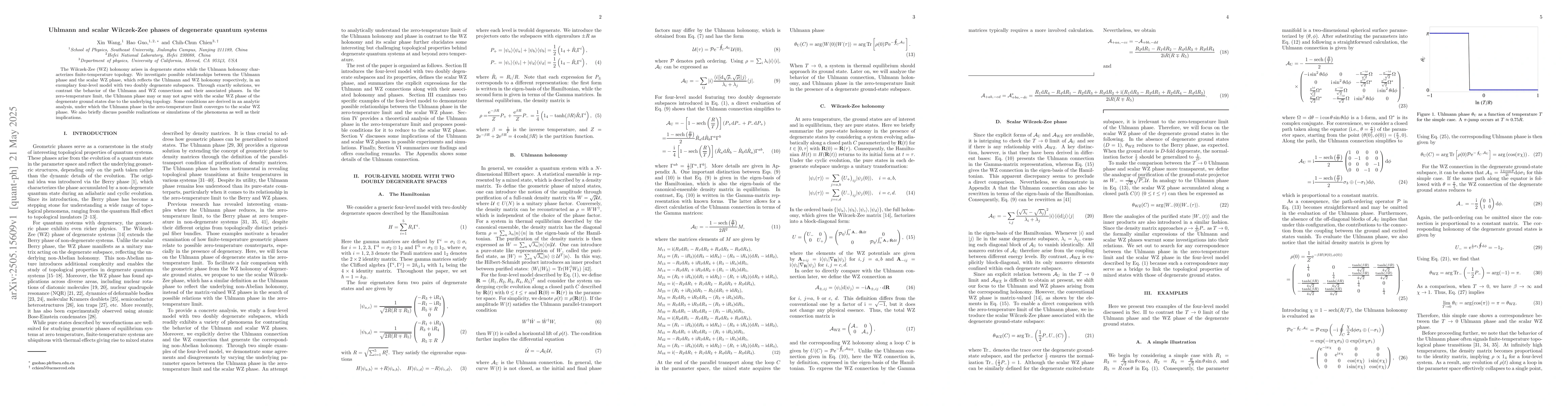 Researchers investigate relationships between Uhlmann and Wilczek-Zee phases in degenerate quantum systems, finding conditions under which the Uhlmann phase converges to the scalar WZ phase at zero temperature.