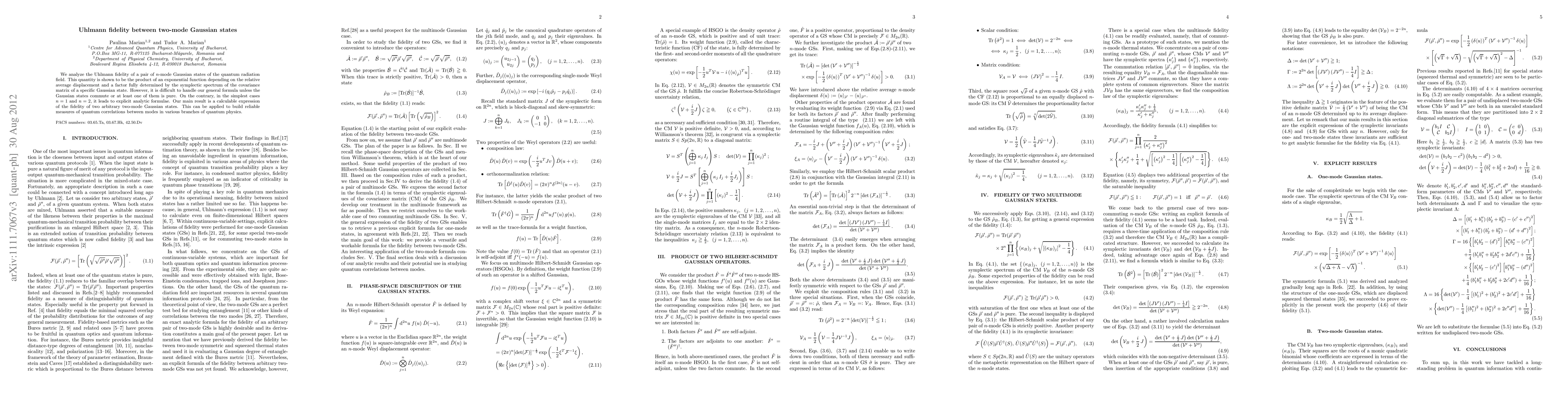 This paper derives an explicit formula for the Uhlmann fidelity between two-mode Gaussian states of the quantum radiation field, showing it depends on relative displacement and the symplectic spectrum of the covariance matrix. The formula is particularly useful for measuring quantum correlations in simple cases like $n=1$ and $n=2$.