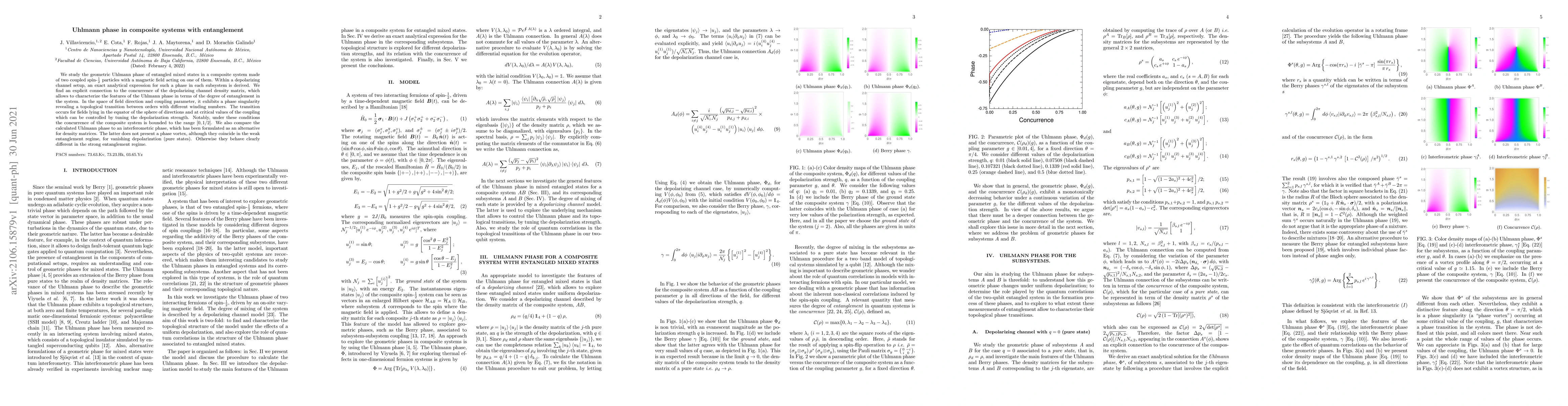 We study the geometric Uhlmann phase of entangled mixed states in a composite system made of two coupled spin-$\frac 1 2$ particles with a magnetic field acting on one of them. Within a depolarizing channel setup, an exact analytical expression for such a phase in each subsystem is derived. We find an explicit connection to the concurrence of the depolarizing channel density matrix, which allows to characterize the features of the Uhlmann phase in terms of the degree of entanglement in the system. In the space of field direction and coupling parameter, it exhibits a phase singularity revealing a topological transition between orders with different winding numbers. The transition occurs for fields lying in the equator of the sphere of directions and at critical values of the coupling which can be controlled by tuning the depolarization strength. Notably, under these conditions the concurrence of the composite system is bounded to the range $[0,1/2]$. We also compare the calculated Uhlmann phase to an interferometric phase, which has been formulated as an alternative for density matrices. The latter does not present a phase vortex, although they coincide in the weak entanglement regime, for vanishing depolarization (pure states). Otherwise they behave clearly different in the strong entanglement regime.