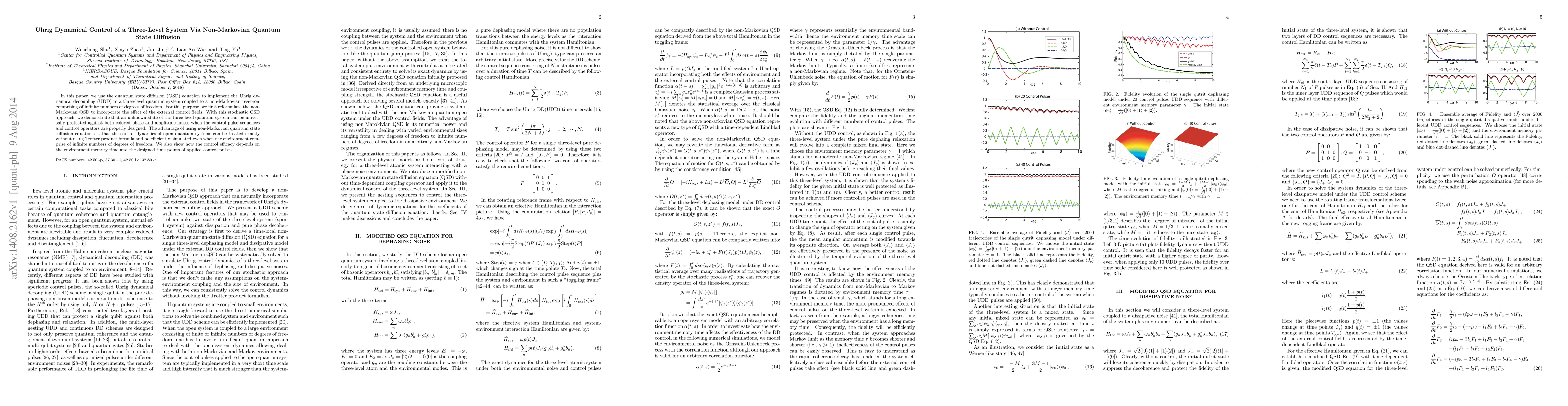 This paper implements Uhrig dynamical decoupling in a three-level quantum system using non-Markovian quantum state diffusion, demonstrating universal protection against phase and amplitude noise. The non-Markovian approach allows for exact treatment of control dynamics without approximations, facilitating efficient simulation even with infinite environmental degrees of freedom.