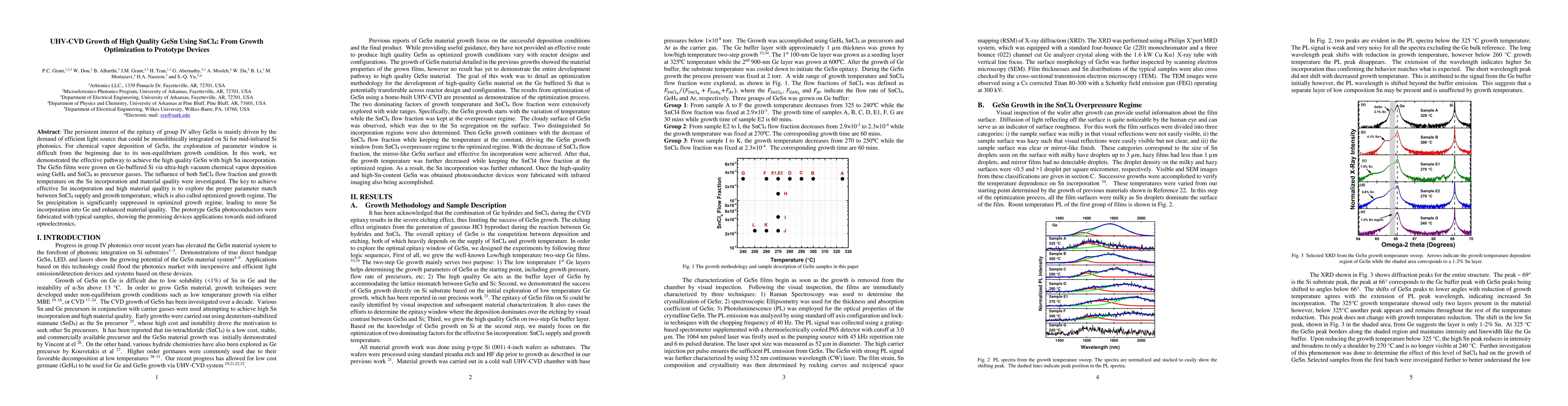 This research demonstrates a method for growing high-quality GeSn using ultra-high vacuum chemical vapor deposition with GeH4 and SnCl4. By optimizing SnCl4 flow fraction and growth temperature, the study achieves high Sn incorporation, suppresses Sn precipitation, and enhances material quality, paving the way for mid-infrared Si photonics devices.