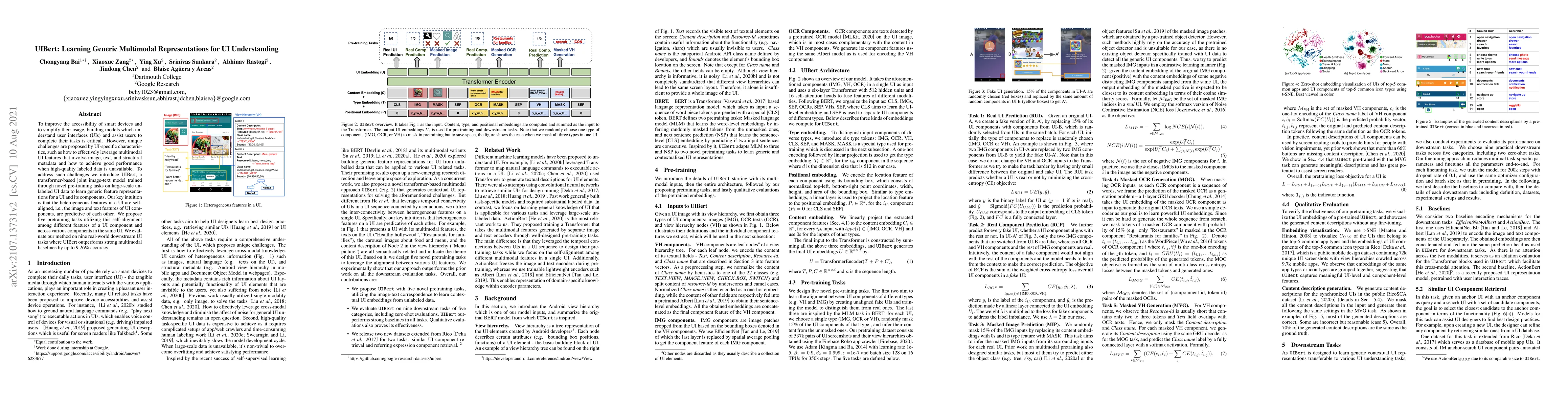 UIBert is a transformer-based model that leverages multimodal features (image, text, and metadata) to understand user interfaces, pre-trained on large-scale unlabeled UI data to create generic representations. It outperforms existing multimodal baselines by up to 9.26% in accuracy on various UI tasks.