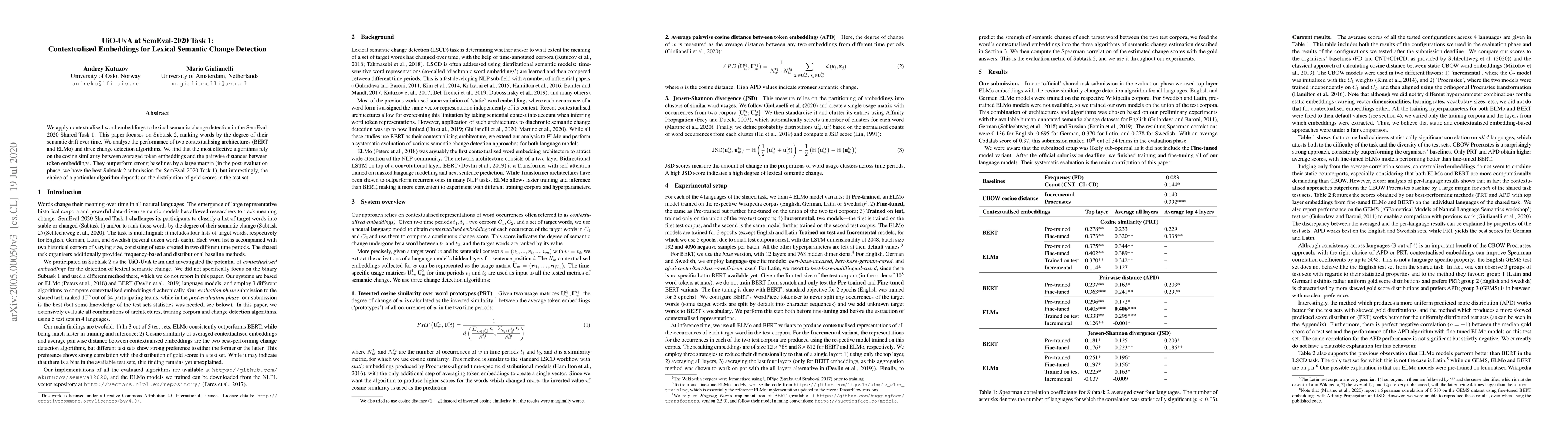 This paper investigates the use of contextualised word embeddings (BERT and ELMo) for detecting lexical semantic change in SemEval-2020 Task 1, Subtask 2. The study finds that cosine similarity and pairwise distances between embeddings outperform baselines, with the best results contingent on the distribution of gold scores in the test set.