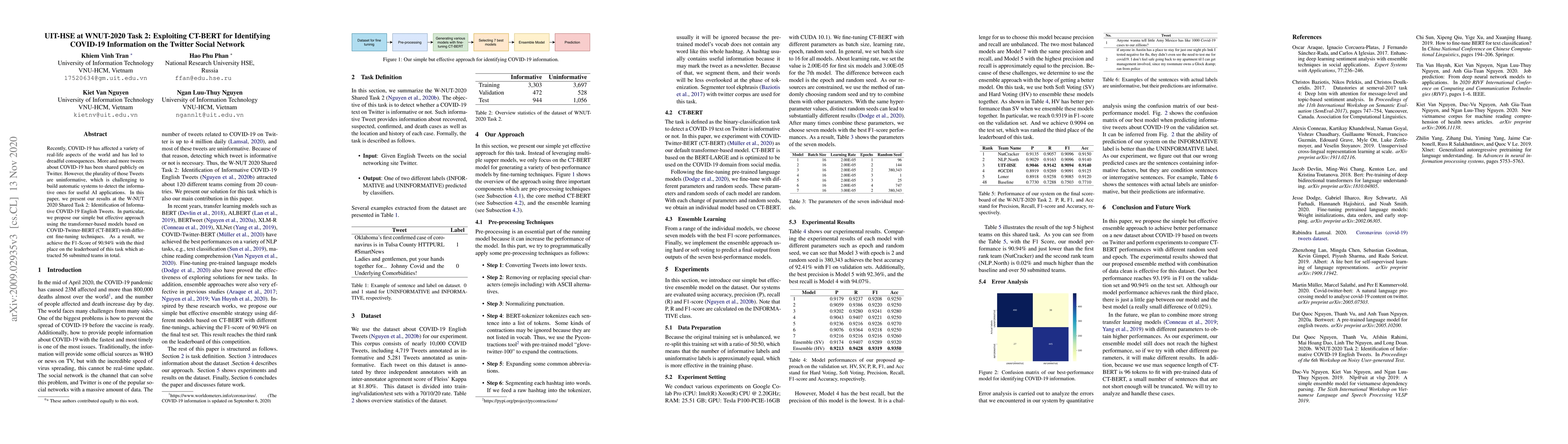 The paper presents a simple yet effective ensemble method using CT-BERT for identifying informative COVID-19 tweets, demonstrating its effectiveness with an F1-Score of 90.94% on the test set.