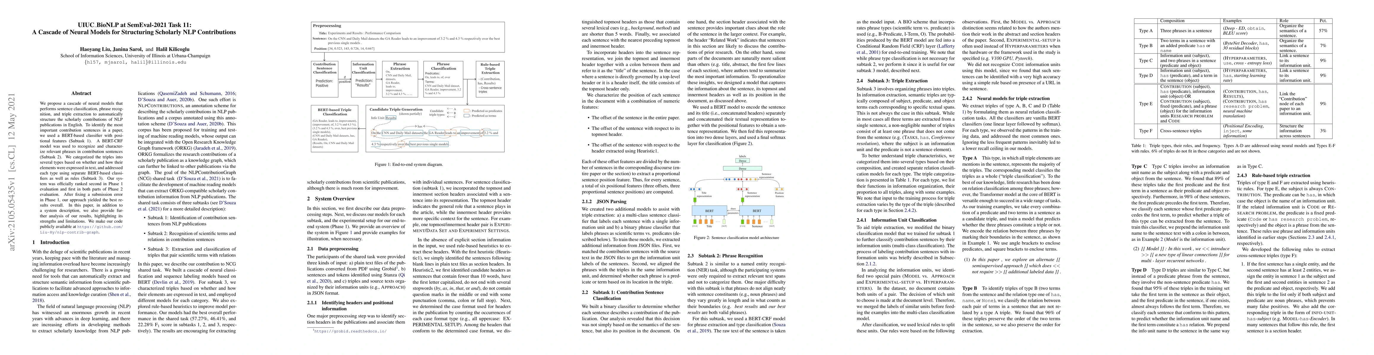 We propose a cascade of neural models that performs sentence classification, phrase recognition, and triple extraction to automatically structure the scholarly contributions of NLP publications. To identify the most important contribution sentences in a paper, we used a BERT-based classifier with positional features (Subtask 1). A BERT-CRF model was used to recognize and characterize relevant phrases in contribution sentences (Subtask 2). We categorized the triples into several types based on whether and how their elements were expressed in text, and addressed each type using separate BERT-based classifiers as well as rules (Subtask 3). Our system was officially ranked second in Phase 1 evaluation and first in both parts of Phase 2 evaluation. After fixing a submission error in Pharse 1, our approach yields the best results overall. In this paper, in addition to a system description, we also provide further analysis of our results, highlighting its strengths and limitations. We make our code publicly available at https://github.com/Liu-Hy/nlp-contrib-graph.