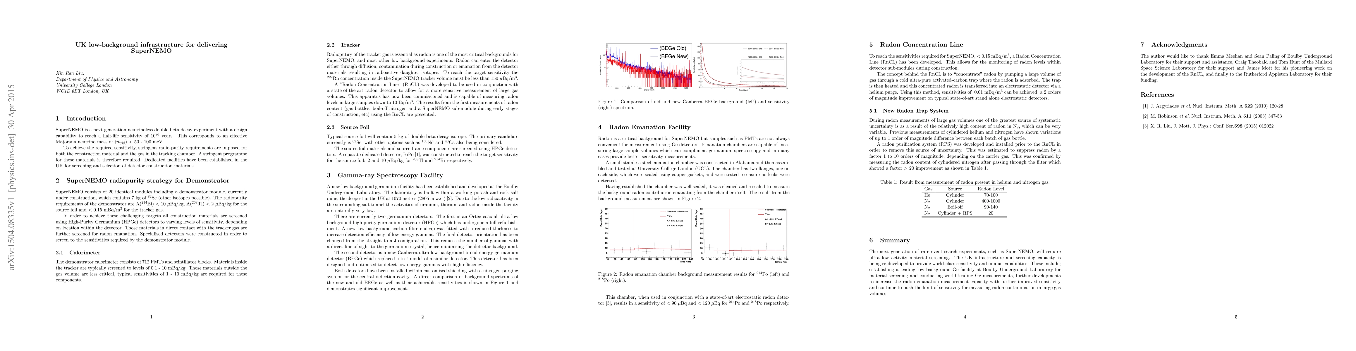 SuperNEMO is a next generation neutrinoless double beta decay experiment with a design capability to reach a half-life sensitivity of $10^{26}$ years corresponding to an effective Majorana neutrino mass of $\langle m_{\beta\beta} \rangle$ $<$ 50 - 100 meV. To achieve this sensitivity, stringent radio-purity requirements are imposed resulting in an equally stringent screening programme. Dedicated facilities have been established in the UK for screening and selection of detector construction materials. Gamma ray spectroscopy using high-purity germanium (HPGe) detectors has been the standard method for the measurement of material contamination. A low-background facility has been established at Boulby Underground Laboratory. The first results from the 2 current HPGe detector are shown. Radon is one of the most critical backgrounds for SuperNEMO and most other low background experiments. It can enter the detector either through diffusion, contamination during construction or emanation from the detector materials resulting in radioactive daughter isotopes. To reach the target sensitivity, the $^{222}$Rn concentration inside the SuperNEMO tracker volume must be less than 150 $\mu$Bq/m3. A "Radon Concentration Line" (RnCL) was developed to be used in conjunction with a state-of-the-art radon detector to make a more sensitive measurement of large gas volumes. This apparatus has now been commissioned and is capable of measuring radon levels in large samples down to 10 $\mu$Bq/m3. The results from first measurements of radon content using the RnCL are presented. These measurements include gas bottles, boil-off nitrogen and a SuperNEMO sub-module during the early stages of construction.