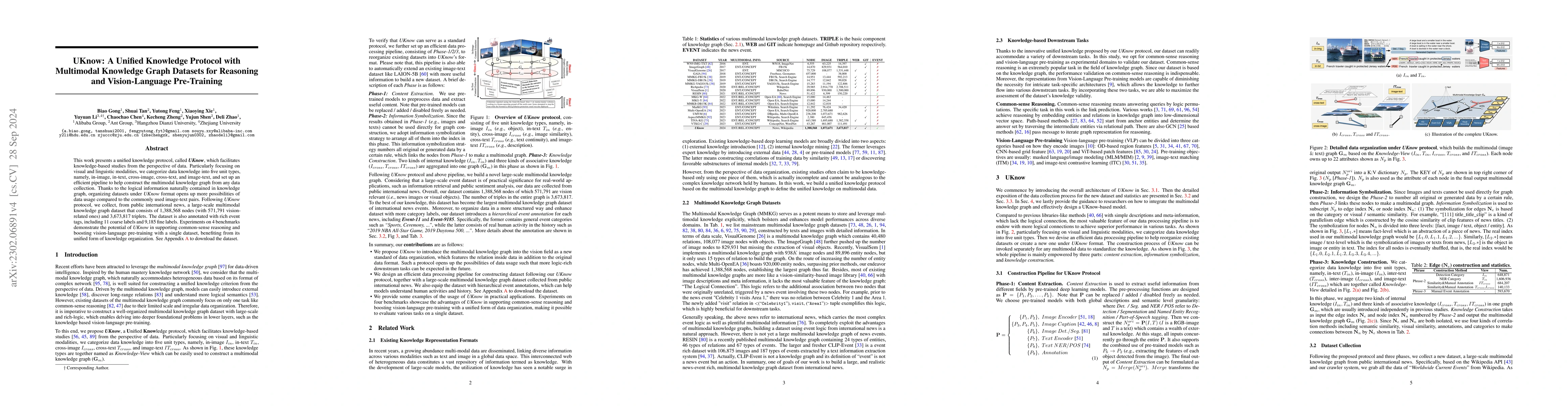 This work presents a unified knowledge protocol, called UKnow, which facilitates knowledge-based studies from the perspective of data. Particularly focusing on visual and linguistic modalities, we categorize data knowledge into five unit types, namely, in-image, in-text, cross-image, cross-text, and image-text, and set up an efficient pipeline to help construct the multimodal knowledge graph from any data collection. Thanks to the logical information naturally contained in knowledge graph, organizing datasets under UKnow format opens up more possibilities of data usage compared to the commonly used image-text pairs. Following UKnow protocol, we collect, from public international news, a large-scale multimodal knowledge graph dataset that consists of 1,388,568 nodes (with 571,791 vision-related ones) and 3,673,817 triplets. The dataset is also annotated with rich event tags, including 11 coarse labels and 9,185 fine labels. Experiments on four benchmarks demonstrate the potential of UKnow in supporting common-sense reasoning and boosting vision-language pre-training with a single dataset, benefiting from its unified form of knowledge organization. Code, dataset, and models will be made publicly available.
