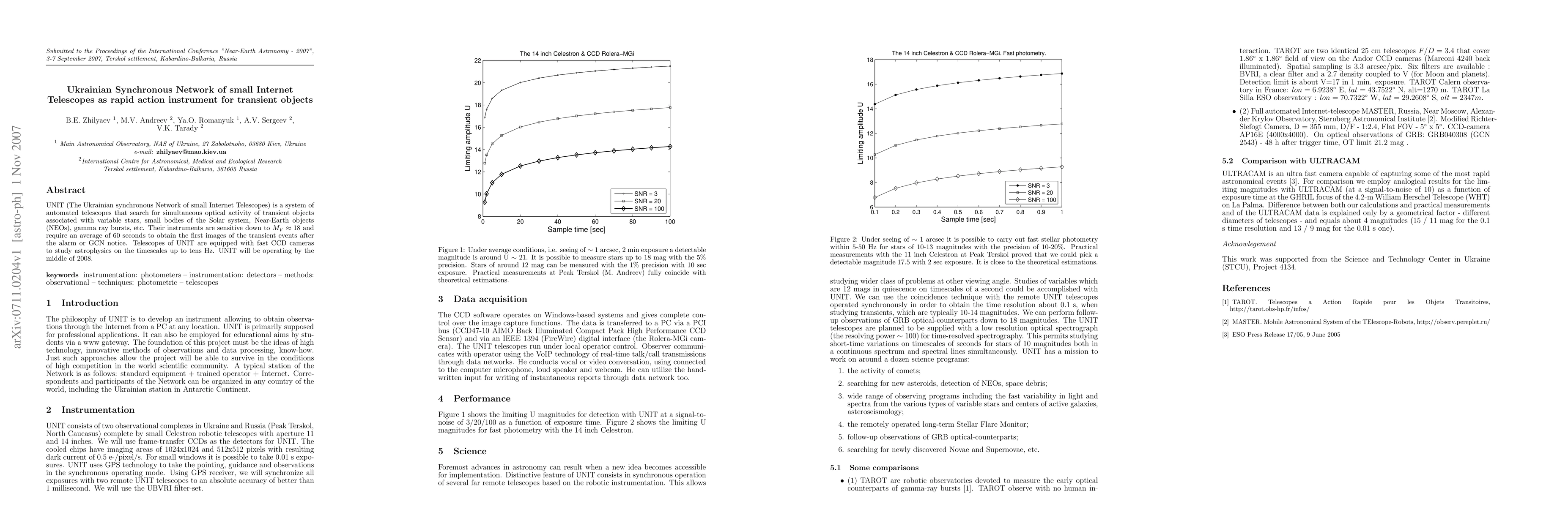 UNIT (The Ukrainian synchronous Network of small Internet Telescopes) is a system of automated telescopes that search for simultaneous optical activity of transient objects associated with variable stars, small bodies of the Solar system, Near-Earth objects (NEOs), gamma ray bursts, etc. Their instruments are sensitive down to $M_{V} \approx 18$ and require an average of 60 seconds to obtain the first images of the transient events after the alarm or GCN notice. Telescopes of UNIT are equipped with fast CCD cameras to study astrophysics on the timescales up to tens Hz. UNIT will be operating by the middle of 2008.