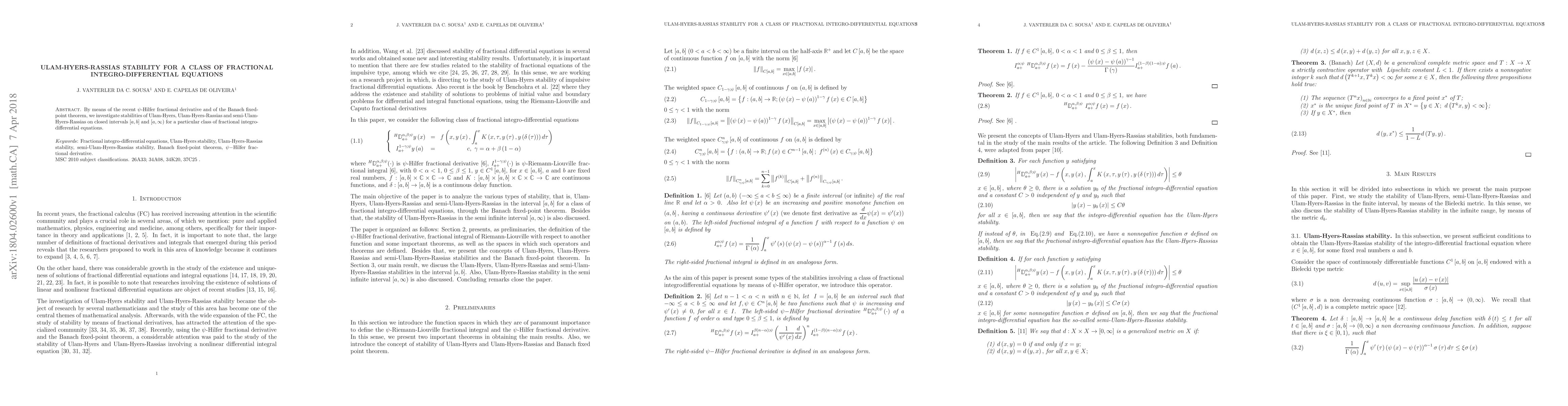 By means of the recent $\psi$-Hilfer fractional derivative and of the Banach fixed-point theorem, we investigate stabilities of Ulam-Hyers, Ulam-Hyers-Rassias and semi-Ulam-Hyers-Rassias on closed intervals $[a,b]$ and $[a,\infty)$ for a particular class of fractional integro-differential equations.