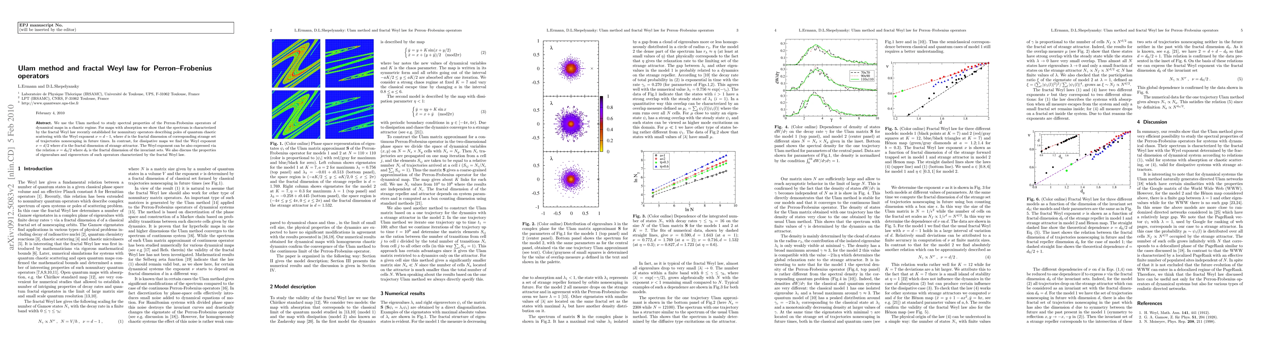 This paper explores the spectral properties of Perron-Frobenius operators using the Ulam method, revealing a fractal Weyl law for chaotic dynamical maps. The Weyl exponent $\nu$ is shown to depend on the fractal dimension $d$ of strange sets, with $\nu=d-1$ for absorbing maps and $\nu=d/2$ for dissipative maps.