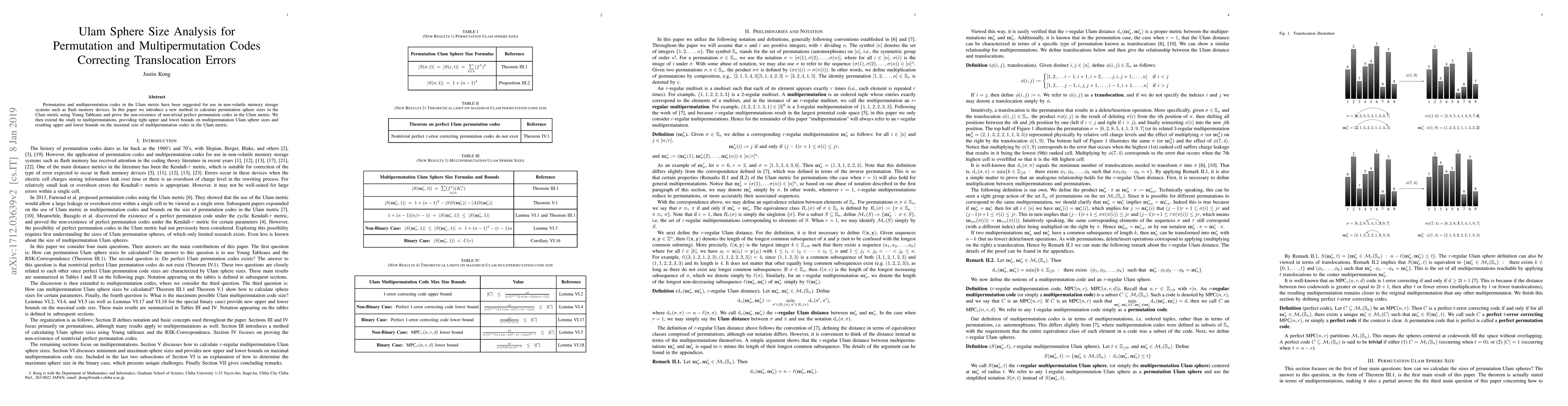 The introduction of a novel method using Young Tableaux for calculating Ulam sphere sizes and the proof of non-existence of non-trivial perfect permutation codes.