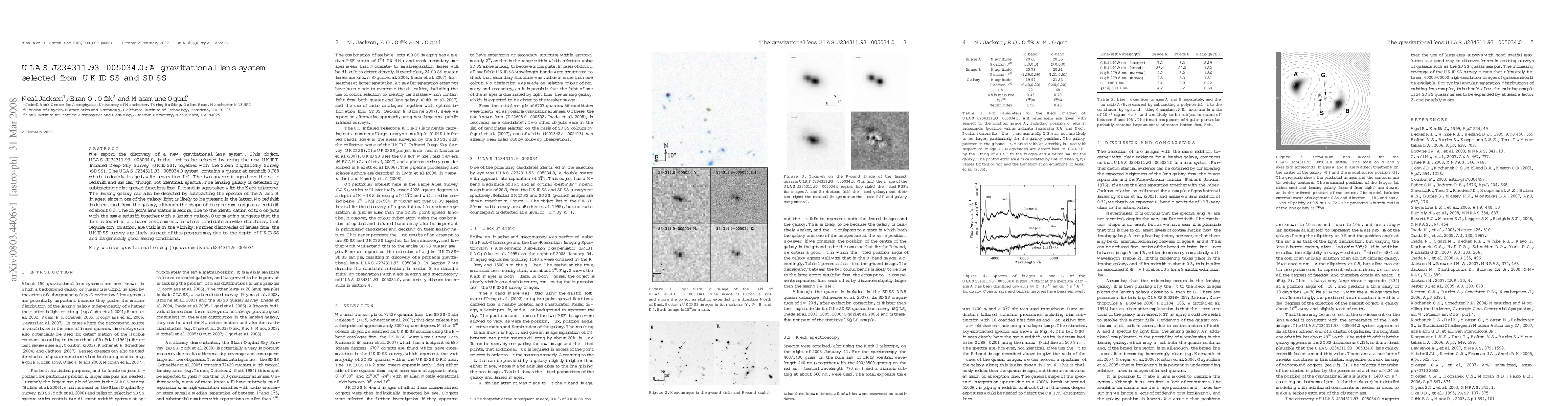 We report the discovery of a new gravitational lens system. This object, ULAS J234311.93-005034.0, is the first to be selected by using the new UKIRT Infrared Deep Sky Survey (UKIDSS), together with the Sloan Digital Sky Survey (SDSS). The ULAS J234311.93-005034.0 system contains a quasar at redshift 0.788 which is doubly imaged, with separation 1.4". The two quasar images have the same redshift and similar, though not identical, spectra. The lensing galaxy is detected by subtracting point-spread functions from R-band images taken with the Keck telescope. The lensing galaxy can also be detected by subtracting the spectra of the A and B images, since more of the galaxy light is likely to be present in the latter. No redshift is determined from the galaxy, although the shape of its spectrum suggests a redshift of about 0.3. The object's lens status is secure, due to the identification of two objects with the same redshift together with a lensing galaxy. Our imaging suggests that the lens is found in a cluster environment, in which candidate arc-like structures, that require confirmation, are visible in the vicinity. Further discoveries of lenses from the UKIDSS survey are likely as part of this programme, due to the depth of UKIDSS and its generally good seeing conditions.