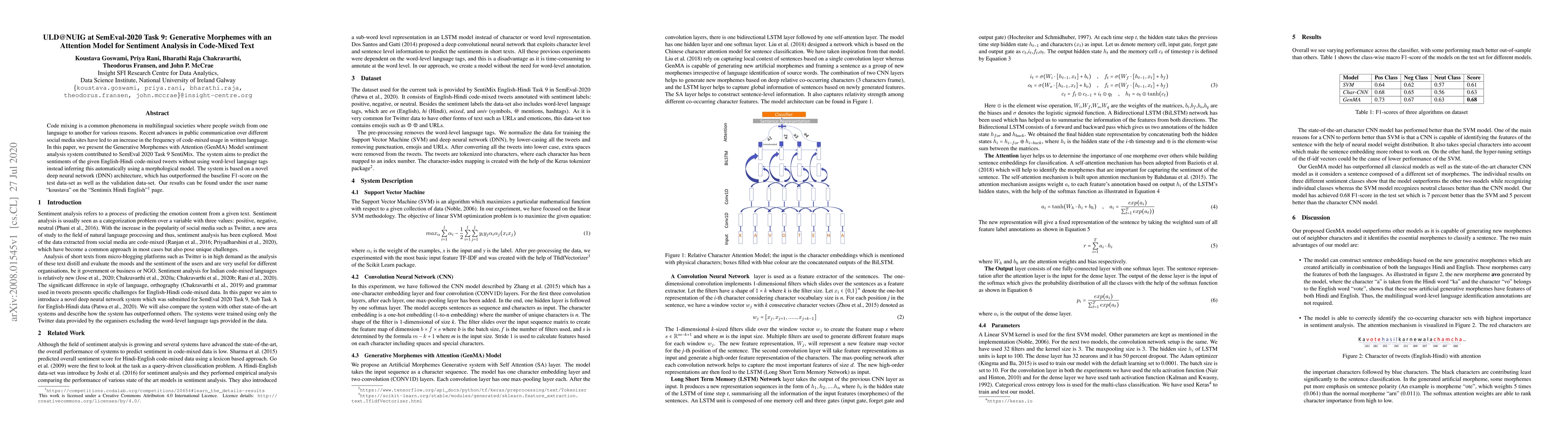 This paper introduces the Generative Morphemes with Attention (GenMA) Model for sentiment analysis in English-Hindi code-mixed tweets, achieving superior performance over baselines by leveraging a novel deep neural network architecture without relying on word-level language tags. Results are available under the username "koustava" on the "Sentimix Hindi English" page.