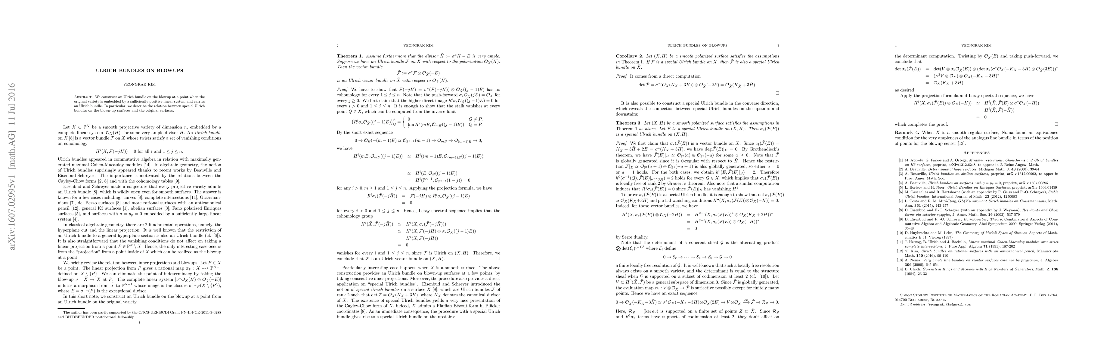 Summary: This paper constructs an Ulrich bundle on the blowup of a variety embedded by a sufficiently positive linear system, and explores the relationship between Ulrich bundles on the original and blown-up surfaces.