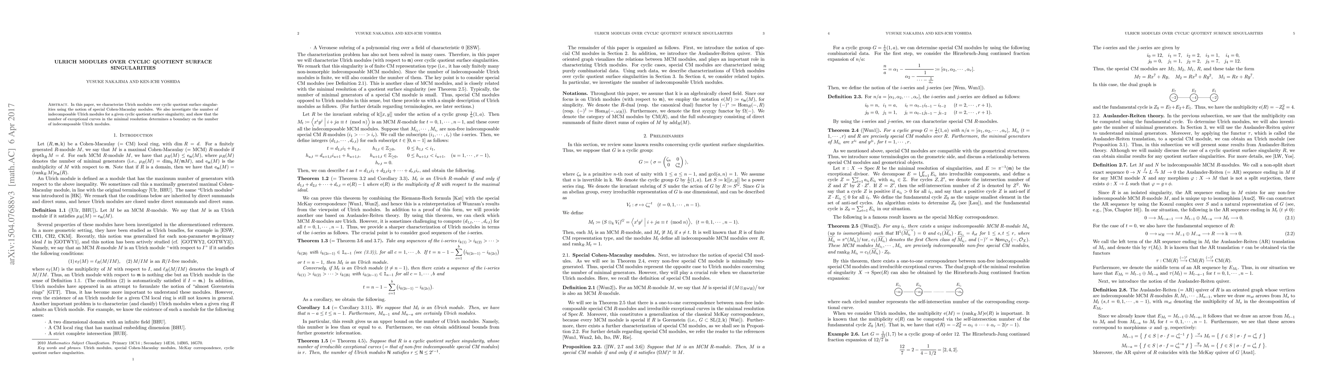 The paper introduces a novel characterization of Ulrich modules over cyclic quotient surface singularities using special Cohen-Macaulay modules and establishes a relationship between the number of indecomposable Ulrich modules and the minimal resolution's exceptional curves.