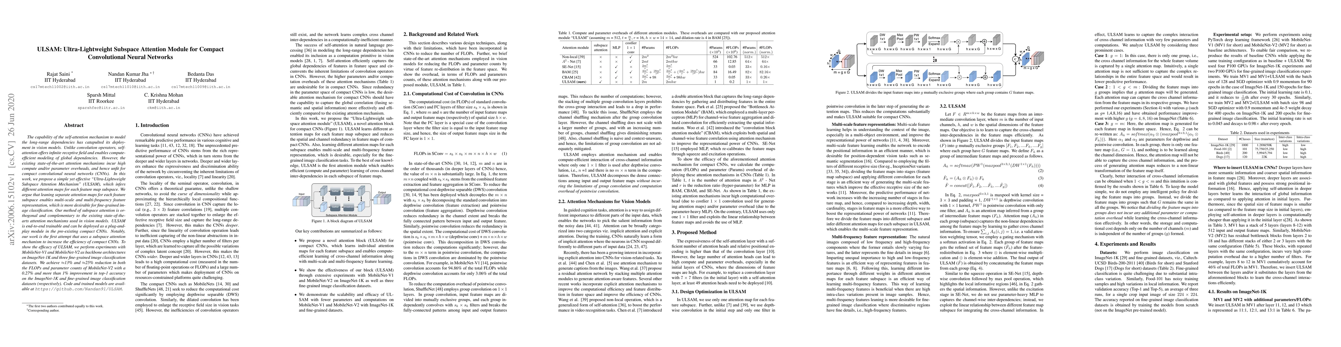 The paper proposes the Ultra-Lightweight Subspace Attention Module (ULSAM) to enhance compact convolutional neural networks (CNNs) by efficiently modeling global dependencies without high computational costs. ULSAM achieves significant reductions in FLOPs and parameters while improving accuracy on ImageNet-1K and fine-grained image classification datasets.