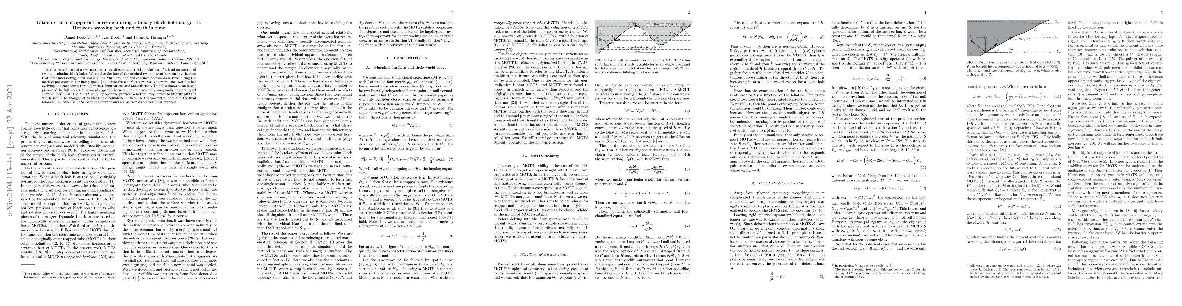 In this second part of a two-part paper, we discuss numerical simulations of a head-on merger of two non-spinning black holes. We resolve the fate of the original two apparent horizons by showing that after intersecting, their world tubes "turn around" and continue backwards in time. Using the method presented in the first paper to locate these surfaces, we resolve several such world tubes evolving and connecting through various bifurcations and annihilations. This also draws a consistent picture of the full merger in terms of apparent horizons, or more generally, marginally outer trapped surfaces (MOTSs). The MOTS stability operator provides a natural mechanism to identify MOTSs which should be thought of as black hole boundaries. These are the two initial ones and the final remnant. All other MOTSs lie in the interior and are neither stable nor inner trapped.