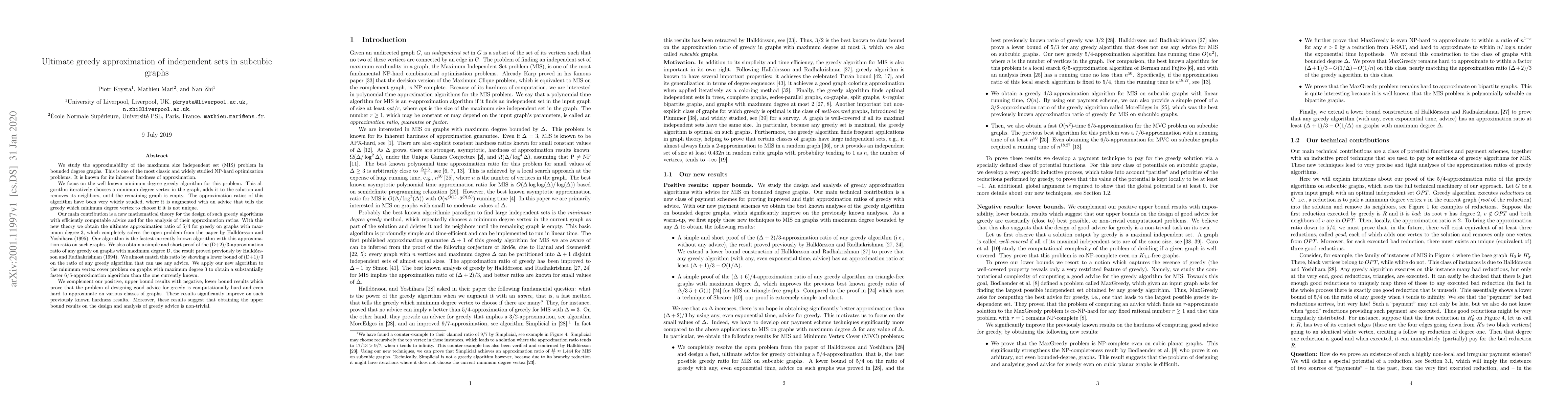This paper develops a new mathematical theory for designing and analyzing greedy algorithms for the maximum independent set problem in subcubic graphs, achieving an ultimate 5/4 approximation ratio. It also presents a faster 6/5-approximation algorithm for the minimum vertex cover problem on such graphs, and provides computational hardness results for designing effective greedy advice.
