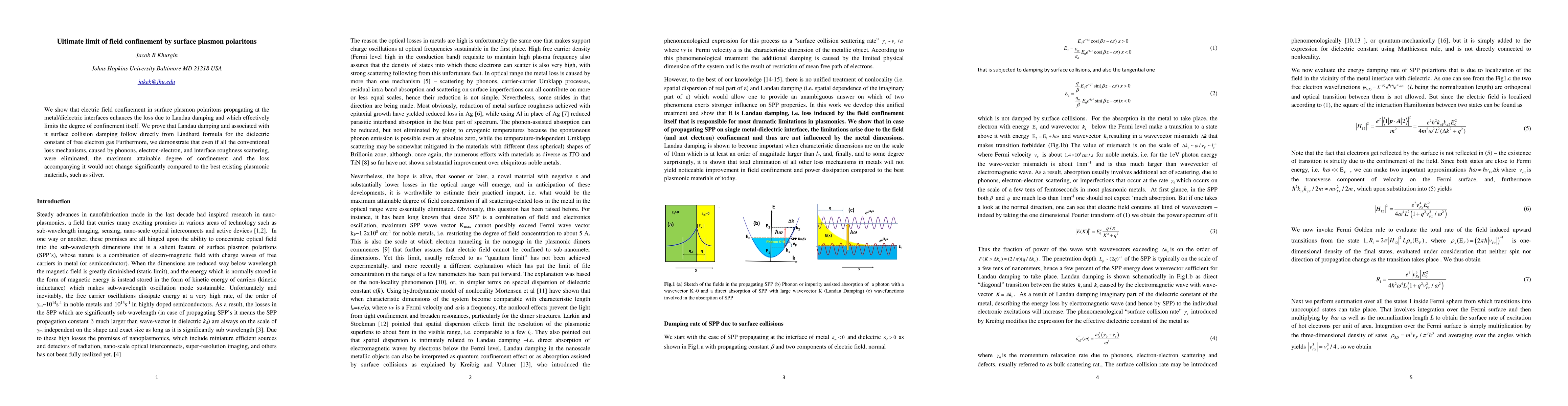 This paper demonstrates that the ultimate limit of electric field confinement by surface plasmon polaritons is constrained by Landau damping, which cannot be significantly overcome even if conventional loss mechanisms are eliminated. The study shows that the intrinsic damping limits the degree of confinement, regardless of material improvements.
