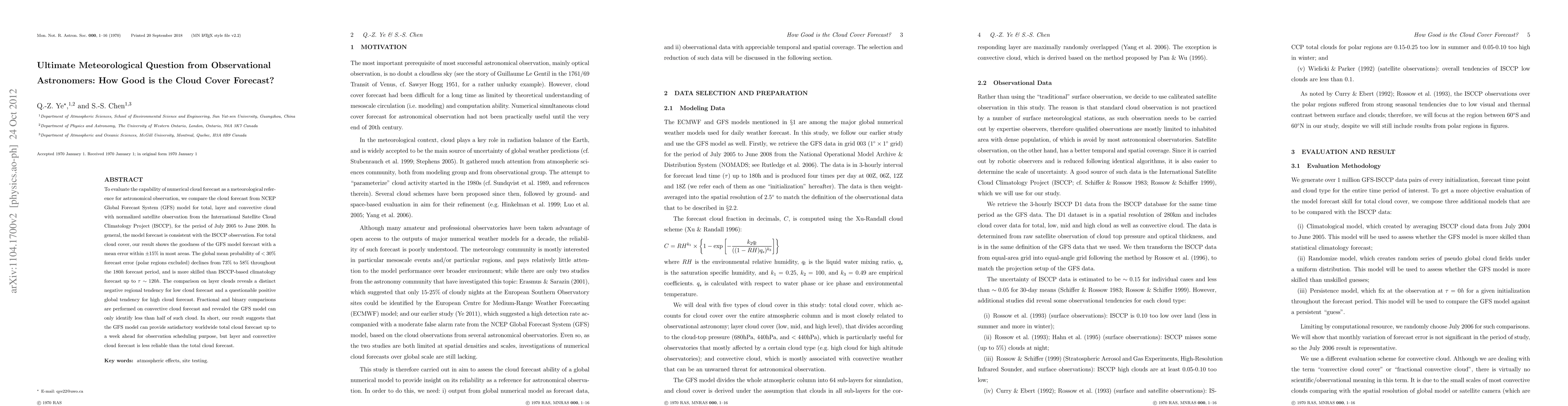 To evaluate the capability of numerical cloud forecast as a meteorological reference for astronomical observation, we compare the cloud forecast from NCEP Global Forecast System (GFS) model for total, layer and convective cloud with normalized satellite observation from the International Satellite Cloud Climatology Project (ISCCP), for the period of July 2005 to June 2008. In general, the model forecast is consistent with the ISCCP observation. For total cloud cover, our result shows the goodness of the GFS model forecast with a mean error within +/-15% in most areas. The global mean probability of < 30% forecast error (polar regions excluded) declines from 73% to 58% throughout the 180h forecast period, and is more skilled than ISCCP-based climatology forecast up to tau~120h. The comparison on layer clouds reveals a distinct negative regional tendency for low cloud forecast and a questionable positive global tendency for high cloud forecast. Fractional and binary comparisons are performed on convective cloud forecast and revealed the GFS model can only identify less than half of such cloud. In short, our result suggests that the GFS model can provide satisfactory worldwide total cloud forecast up to a week ahead for observation scheduling purpose, but layer and convective cloud forecast is less reliable than the total cloud forecast.