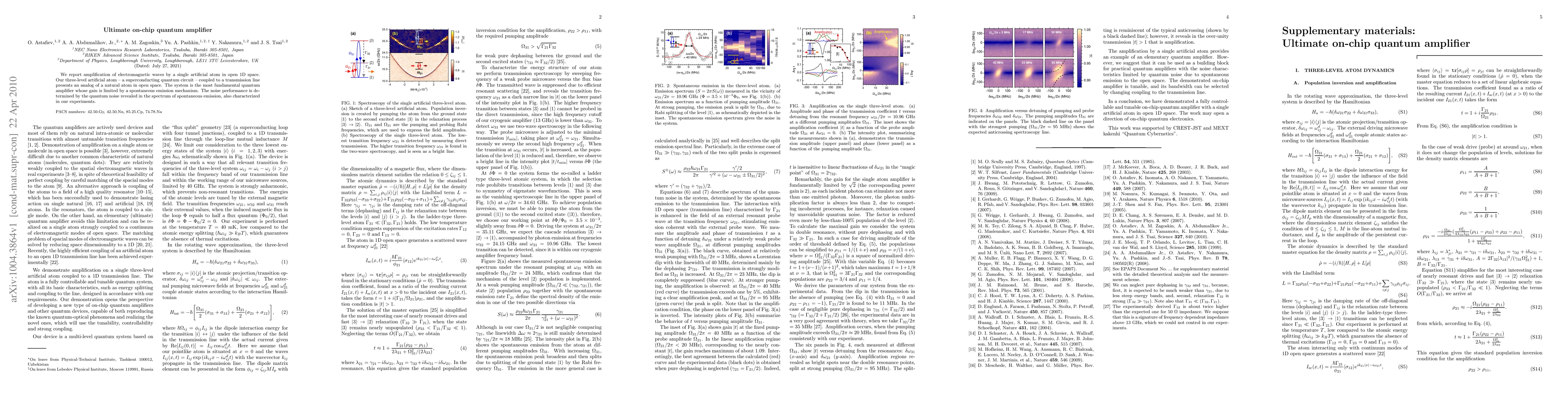 We report amplification of electromagnetic waves by a single artificial atom in open 1D space. Our three-level artificial atom -- a superconducting quantum circuit -- coupled to a transmission line presents an analog of a natural atom in open space. The system is the most fundamental quantum amplifier whose gain is limited by a spontaneous emission mechanism. The noise performance is determined by the quantum noise revealed in the spectrum of spontaneous emission, also characterized in our experiments.