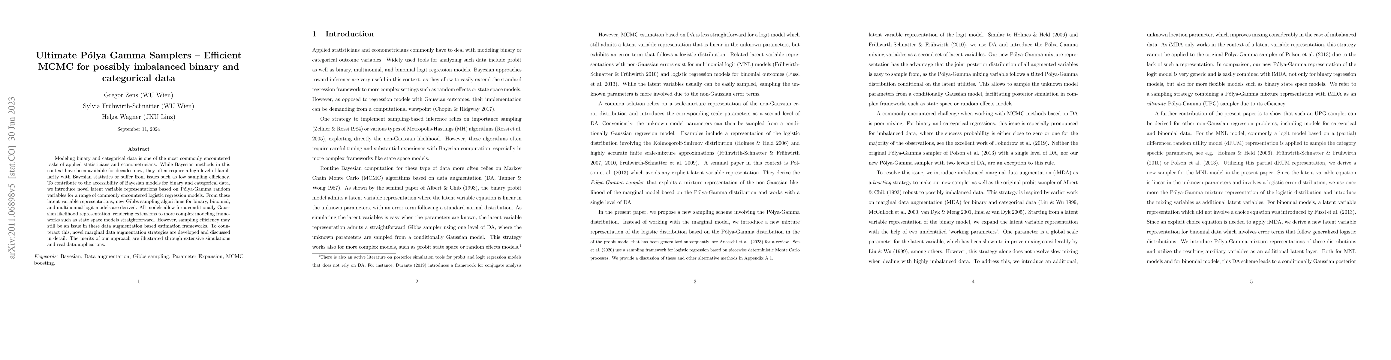 Modeling binary and categorical data is one of the most commonly encountered tasks of applied statisticians and econometricians. While Bayesian methods in this context have been available for decades now, they often require a high level of familiarity with Bayesian statistics or suffer from issues such as low sampling efficiency. To contribute to the accessibility of Bayesian models for binary and categorical data, we introduce novel latent variable representations based on P\'olya-Gamma random variables for a range of commonly encountered logistic regression models. From these latent variable representations, new Gibbs sampling algorithms for binary, binomial, and multinomial logit models are derived. All models allow for a conditionally Gaussian likelihood representation, rendering extensions to more complex modeling frameworks such as state space models straightforward. However, sampling efficiency may still be an issue in these data augmentation based estimation frameworks. To counteract this, novel marginal data augmentation strategies are developed and discussed in detail. The merits of our approach are illustrated through extensive simulations and real data applications.