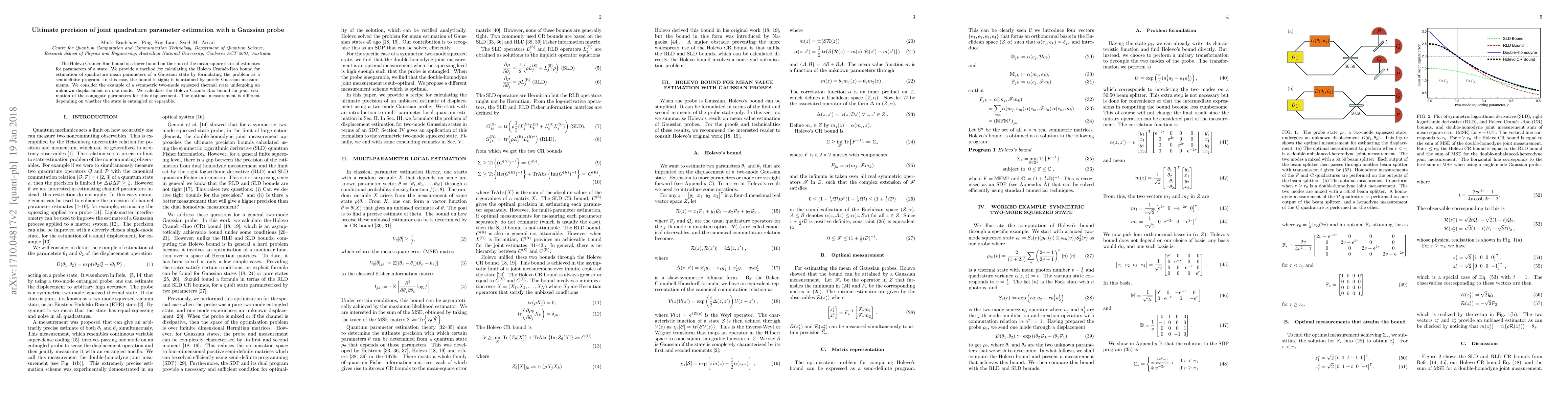 This paper presents a method to calculate the Holevo Cramér-Rao bound for estimating quadrature mean parameters of Gaussian states, formulated as a semidefinite program. The bound is shown to be tight and attained by Gaussian measurements, with optimal measurement strategies differing for entangled versus separable states.