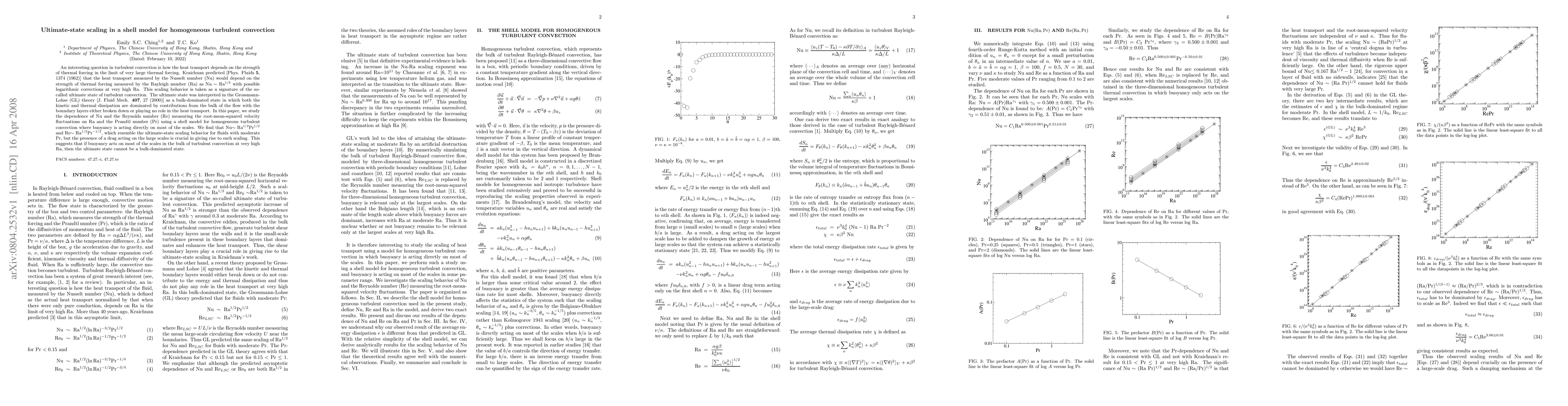 An interesting question in turbulent convection is how the heat transport depends on the strength of thermal forcing in the limit of very large thermal forcing. Kraichnan predicted [Phys. Fluids {\bf 5}, 1374 (1962)] that the heat transport measured by the Nusselt number (Nu) would depend on the strength of thermal forcing measured by the Rayleigh number (Ra) as Nu $\sim$ Ra$^{1/2}$ with possible logarithmic corrections at very high Ra. This scaling behavior is taken as a signature of the so-called ultimate state of turbulent convection. The ultimate state was interpreted in the Grossmann-Lohse (GL) theory [J. Fluid Mech. {\bf 407}, 27 (2000)] as a bulk-dominated state in which both the kinetic and thermal dissipation are dominated by contributions from the bulk of the flow with the boundary layers either broken down or playing no role in the heat transport. In this paper, we study the dependence of Nu and the Reynolds number (Re) measuring the root-mean-squared velocity fluctuations on Ra and the Prandtl number (Pr) using a shell model for homogeneous turbulent convection where buoyancy is acting directly on most of the scales. We find that Nu$\sim$ Ra$^{1/2}$Pr$^{1/2}$ and Re$\sim$ Ra$^{1/2}$Pr$^{-1/2}$, which resemble the ultimate-state scaling behavior for fluids with moderate Pr, but the presence of a drag acting on the large scales is crucial in giving rise to such scaling. This suggests that if buoyancy acts on most of the scales in the bulk of turbulent convection at very high Ra, then the ultimate state cannot be a bulk-dominated state.