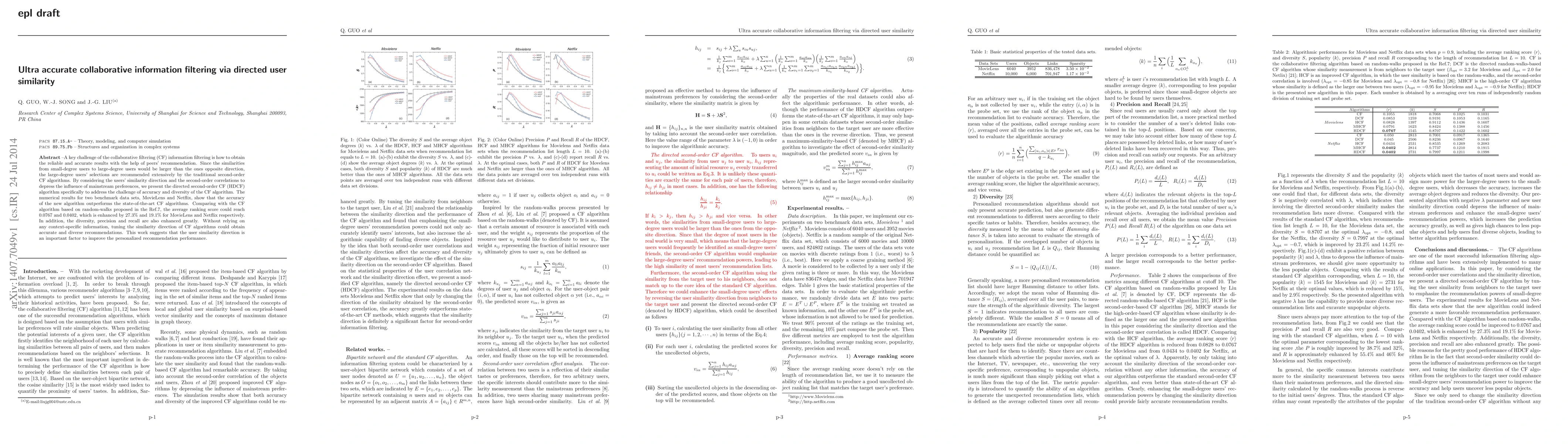 The Directed Second-Order Collaborative Filtering (HDCF) algorithm improves CF accuracy by considering user similarity direction and second-order correlations, outperforming state-of-the-art algorithms on MovieLens and Netflix datasets.