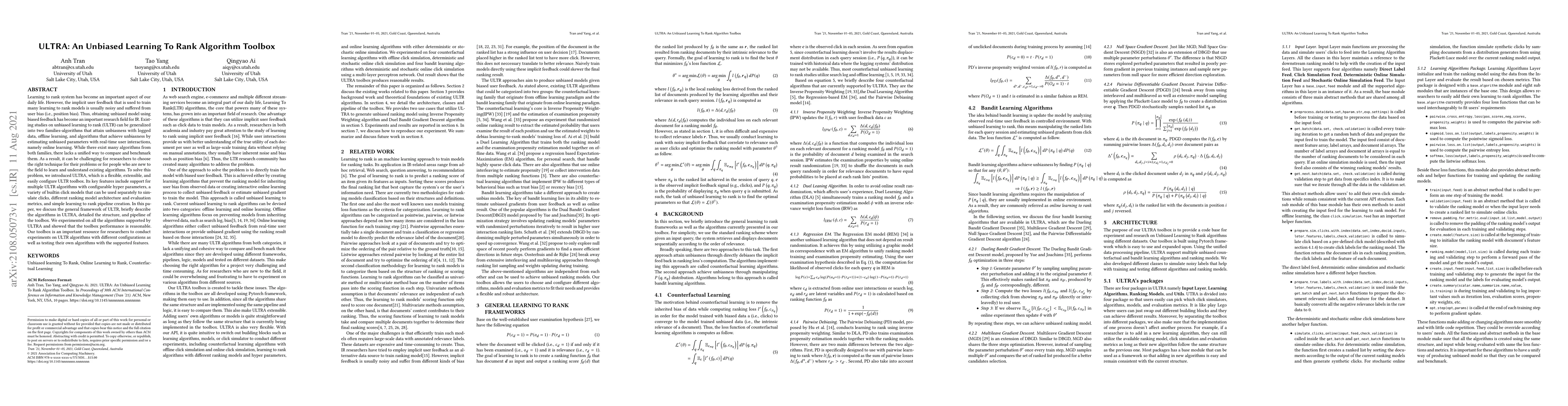 Learning to rank systems has become an important aspect of our daily life. However, the implicit user feedback that is used to train many learning to rank models is usually noisy and suffered from user bias (i.e., position bias). Thus, obtaining an unbiased model using biased feedback has become an important research field for IR. Existing studies on unbiased learning to rank (ULTR) can be generalized into two families-algorithms that attain unbiasedness with logged data, offline learning, and algorithms that achieve unbiasedness by estimating unbiased parameters with real-time user interactions, namely online learning. While there exist many algorithms from both families, there lacks a unified way to compare and benchmark them. As a result, it can be challenging for researchers to choose the right technique for their problems or for people who are new to the field to learn and understand existing algorithms. To solve this problem, we introduced ULTRA, which is a flexible, extensible, and easily configure ULTR toolbox. Its key features include support for multiple ULTR algorithms with configurable hyperparameters, a variety of built-in click models that can be used separately to simulate clicks, different ranking model architecture and evaluation metrics, and simple learning to rank pipeline creation. In this paper, we discuss the general framework of ULTR, briefly describe the algorithms in ULTRA, detailed the structure, and pipeline of the toolbox. We experimented on all the algorithms supported by ultra and showed that the toolbox performance is reasonable. Our toolbox is an important resource for researchers to conduct experiments on ULTR algorithms with different configurations as well as testing their own algorithms with the supported features.