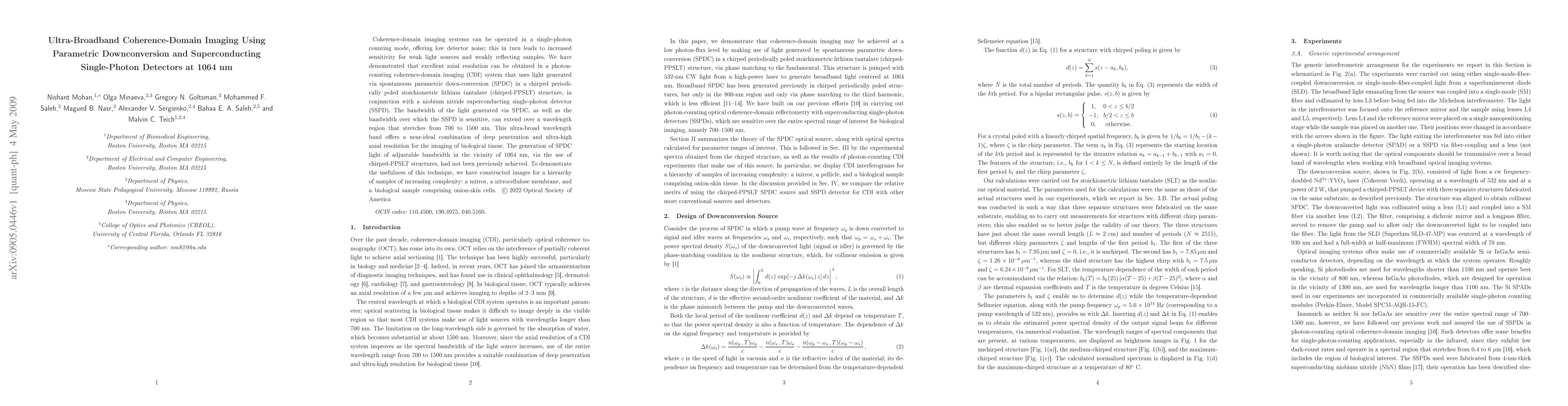 This paper demonstrates an ultra-broadband coherence-domain imaging system using parametric downconversion and superconducting single-photon detectors at 1064 nm, achieving high axial resolution and deep penetration for biological tissue imaging. The system utilizes light generated via SPDC and niobium nitride SSPDs, showcasing the potential for imaging complex samples like onion-skin cells.