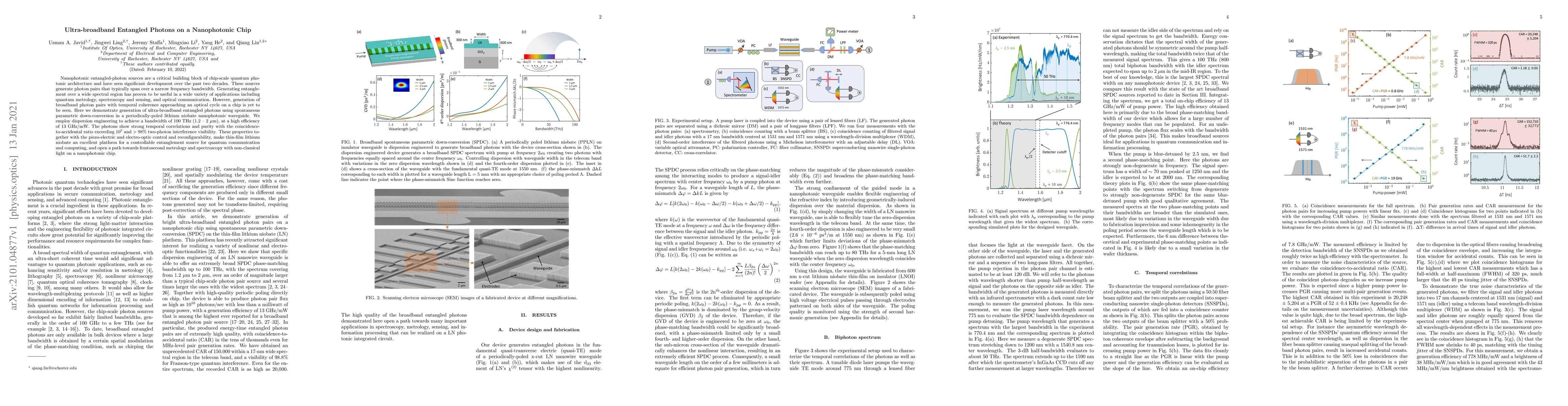 This paper demonstrates the generation of ultra-broadband entangled photons over a 100 THz bandwidth using a periodically-poled lithium niobate nanophotonic waveguide, achieving high efficiency and strong temporal correlations, making it suitable for quantum communication and advanced metrology.