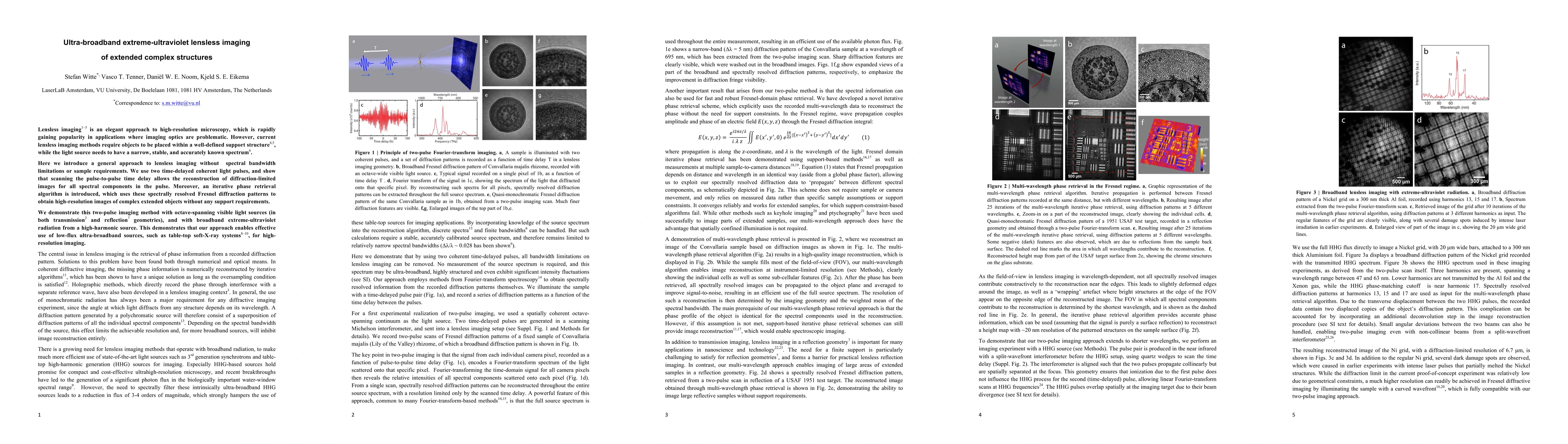 This paper presents a novel lensless imaging technique that overcomes spectral bandwidth limitations and sample support requirements by using two time-delayed coherent light pulses. The method reconstructs diffraction-limited images across a broad spectrum and demonstrates high-resolution imaging in visible and extreme-ultraviolet ranges.