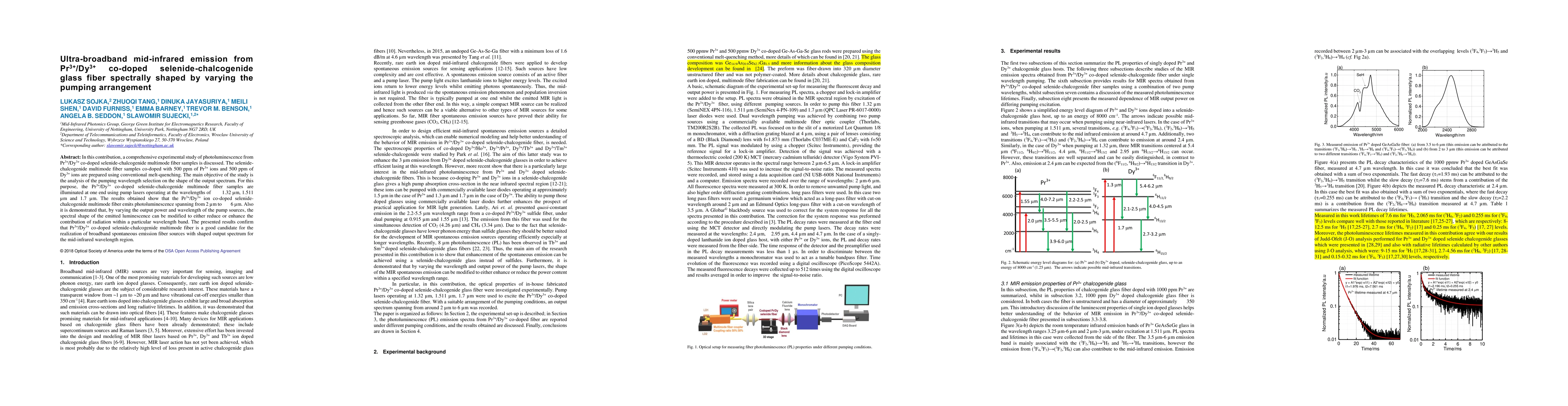 In this contribution, a comprehensive experimental study of photoluminescence from Pr3+/Dy3+ co-doped selenide-chalcogenide multimode fiber samples is discussed. The selenide-chalcogenide multimode fiber samples co-doped with 500 ppm of Pr3+ ions and 500 ppm of Dy3+ ions are prepared using conventional melt-quenching. The main objective of the study is the analysis of the pumping wavelength selection on the shape of the output spectrum. For this purpose, the Pr3+/Dy3+ co-doped selenide-chalcogenide multimode fiber samples are illuminated at one end using pump lasers operating at the wavelengths of 1320 nm , 1511 nm and 1700 nm. The results obtained show that the Pr3+/Dy3+ ion co-doped selenide-chalcogenide multimode fiber emits photoluminescence spanning from 2000 nm to 6000 nm. Also it is demonstrated that, by varying the output power and wavelength of the pump sources, the spectral shape of the emitted luminescence can be modified to either reduce or enhance the contribution of radiation within a particular wavelength band. The presented results confirm that Pr3+/Dy3+ co-doped selenide-chalcogenide multimode fiber is a good candidate for the realization of broadband spontaneous emission fiber sources with shaped output spectrum for the mid-infrared wavelength region.