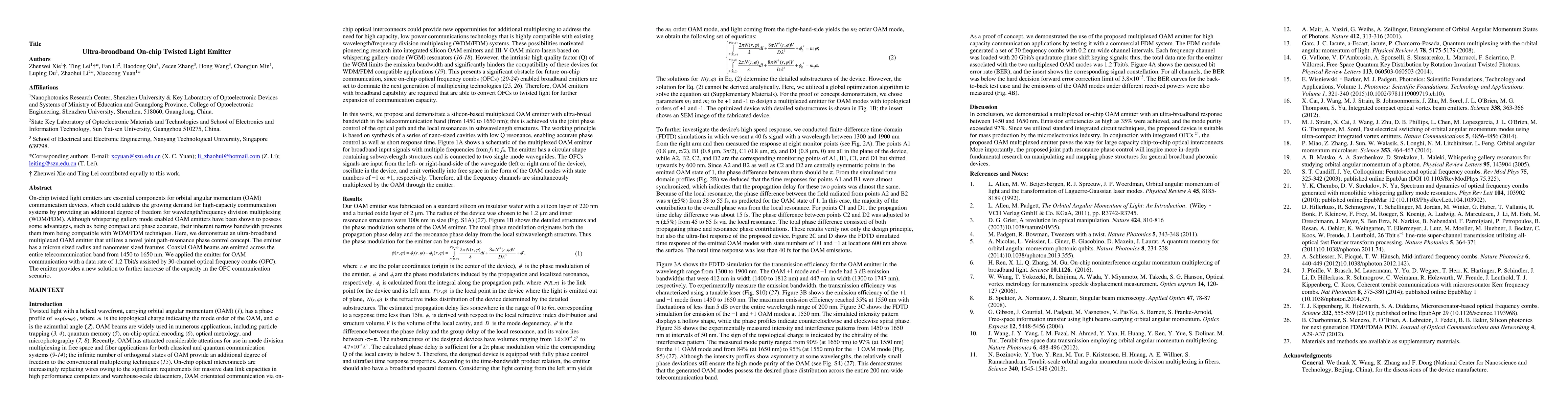 On-chip twisted light emitters are essential components for orbital angular momentum (OAM) communication devices, which could address the growing demand for high-capacity communication systems by providing an additional degree of freedom for wavelength/frequency division multiplexing (WDM/FDM). Although whispering gallery mode enabled OAM emitters have been shown to possess some advantages, such as being compact and phase accurate, their inherent narrow bandwidth prevents them from being compatible with WDM/FDM techniques. Here, we demonstrate an ultra-broadband multiplexed OAM emitter that utilizes a novel joint path-resonance phase control concept. The emitter has a micron sized radius and nanometer sized features. Coaxial OAM beams are emitted across the entire telecommunication band from 1450 to 1650 nm. We applied the emitter for OAM communication with a data rate of 1.2 Tbit/s assisted by 30-channel optical frequency combs (OFC). The emitter provides a new solution to further increase of the capacity in the OFC communication scenario.