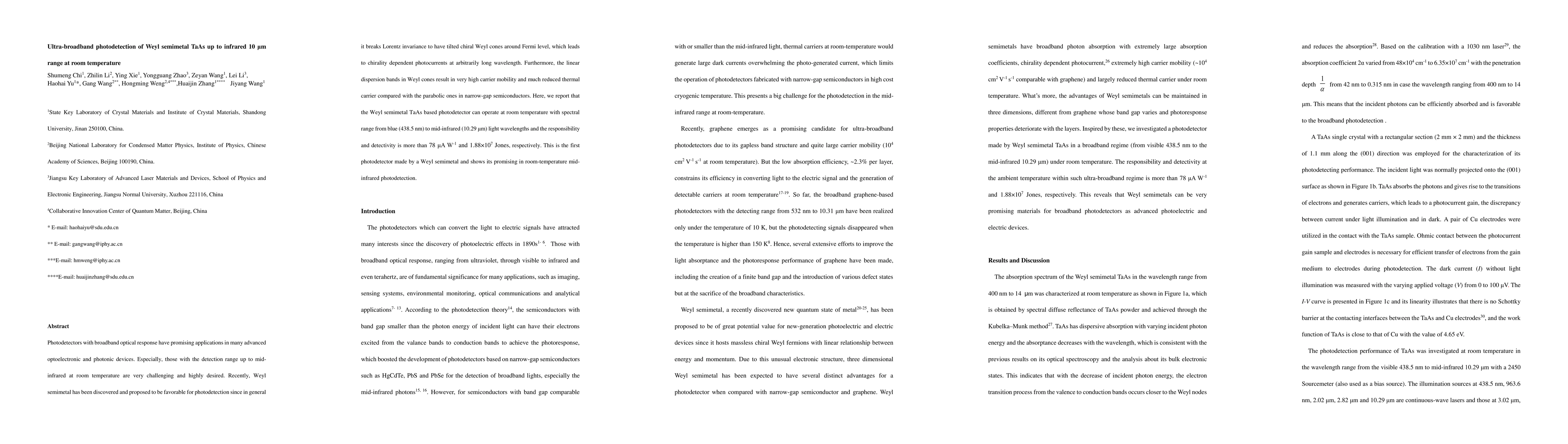 This paper reports the first Weyl semimetal TaAs based photodetector capable of ultra-broadband photodetection from blue to mid-infrared wavelengths (438.5 nm to 10.29 μm) at room temperature, demonstrating high responsibility and detectivity. The study highlights the potential of Weyl semimetals for advanced optoelectronic and photonic devices.