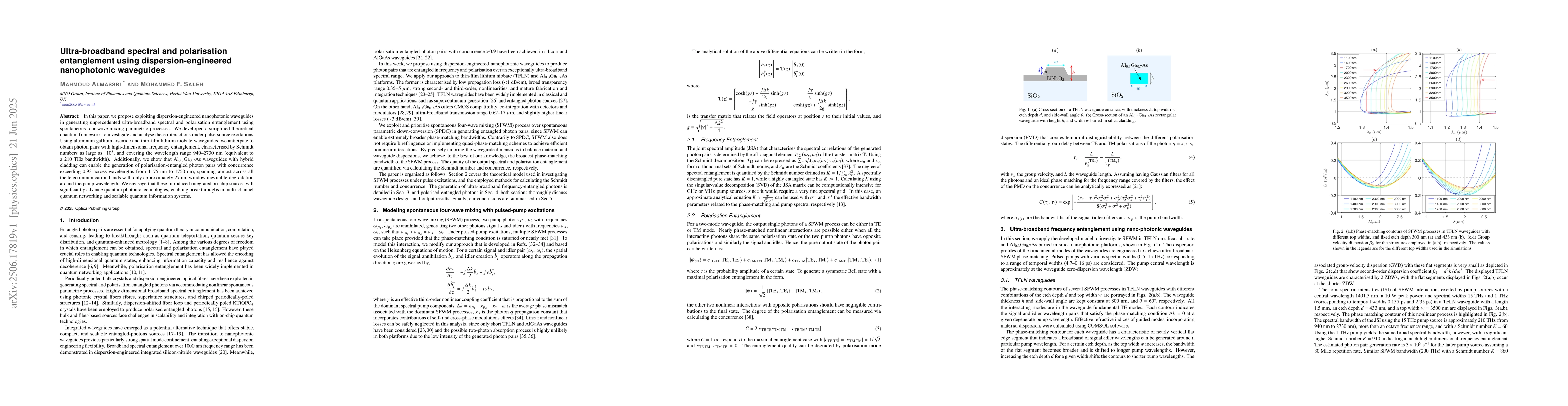This research proposes using dispersion-engineered nanophotonic waveguides to create ultra-broadband spectral and polarisation entangled photon pairs via spontaneous four-wave mixing. Utilizing AlGaAs and LiNbO3 waveguides, the method generates high-dimensional frequency entanglement (Schmidt numbers ~10^8) over 940--2730 nm (210 THz bandwidth). Al0.3Ga0.7As waveguides with hybrid cladding produce polarisation-entangled pairs with concurrence >0.93 across telecommunication bands, except a 27 nm window around the pump. These on-chip sources are expected to greatly advance quantum photonics for multi-channel networking and scalable quantum information systems.