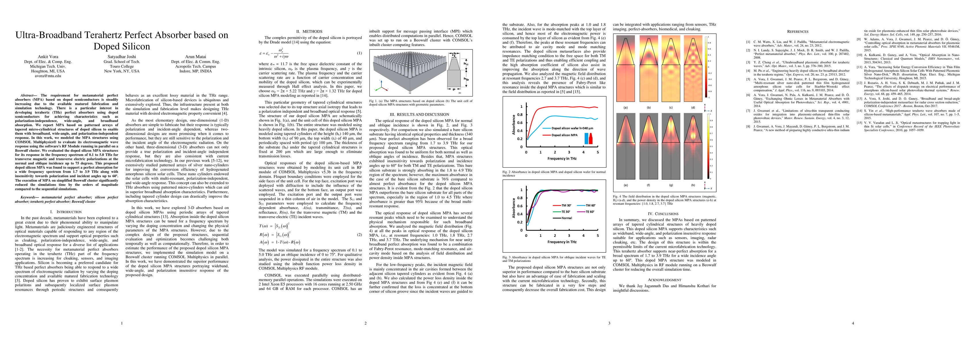 This paper presents a metamaterial perfect absorber (MPA) based on patterned arrays of doped silicon micro-cylindrical structures, achieving broadband, wide-angle, and polarization-independent absorption from 1.7 to 3.9 THz. Simulation results using COMSOL Multiphysics on a Beowulf cluster significantly reduced computation time.