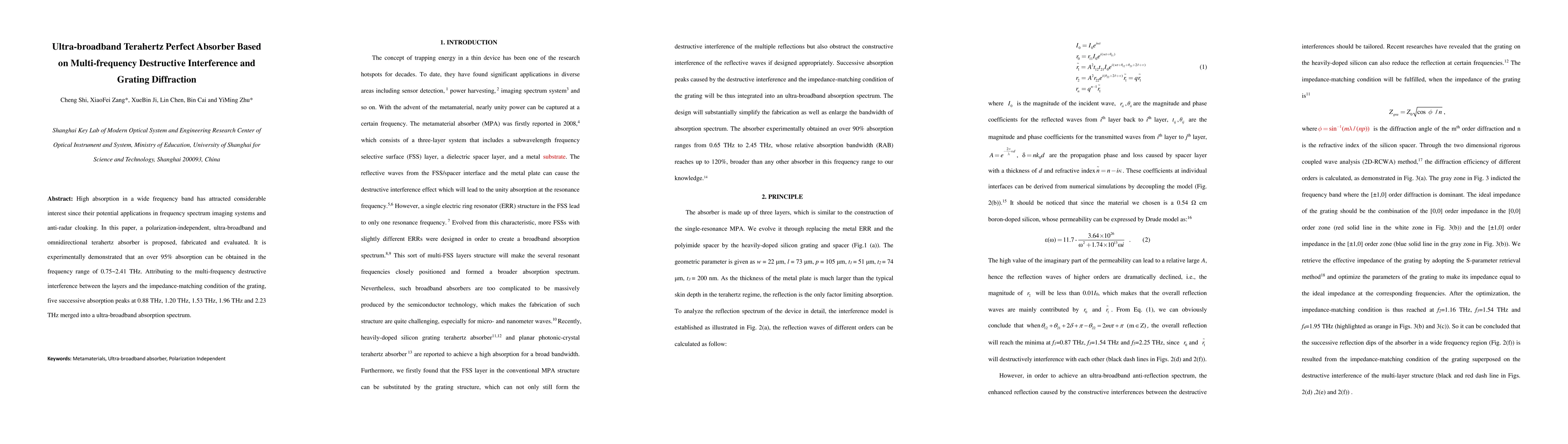 This paper proposes and evaluates a polarization-independent, ultra-broadband terahertz absorber achieving over 95% absorption from 0.75 to 2.41 THz through multi-frequency destructive interference and grating diffraction. The design merges five absorption peaks into a continuous spectrum.
