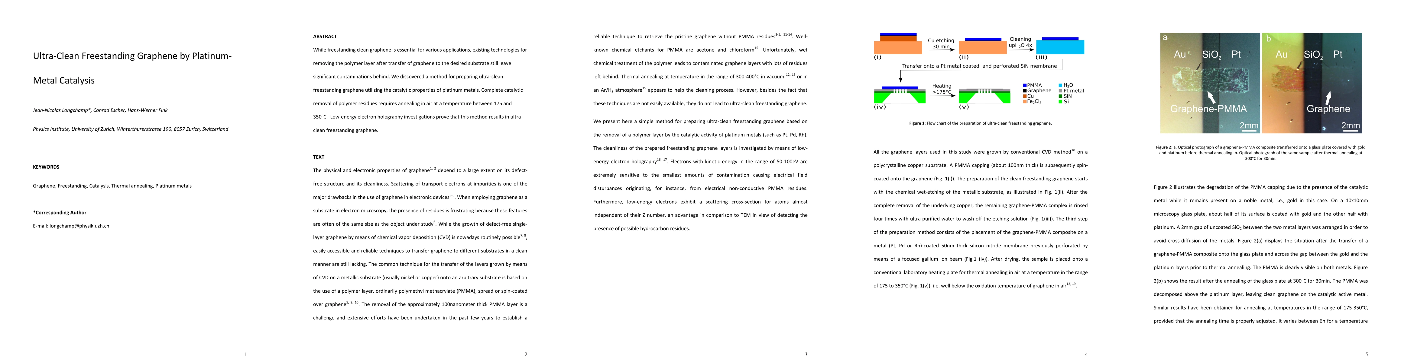 This research introduces a novel method for producing ultra-clean freestanding graphene using platinum-metal catalysis, achieving complete removal of polymer residues through annealing in air at 175-350°C, confirmed by low-energy electron holography.
