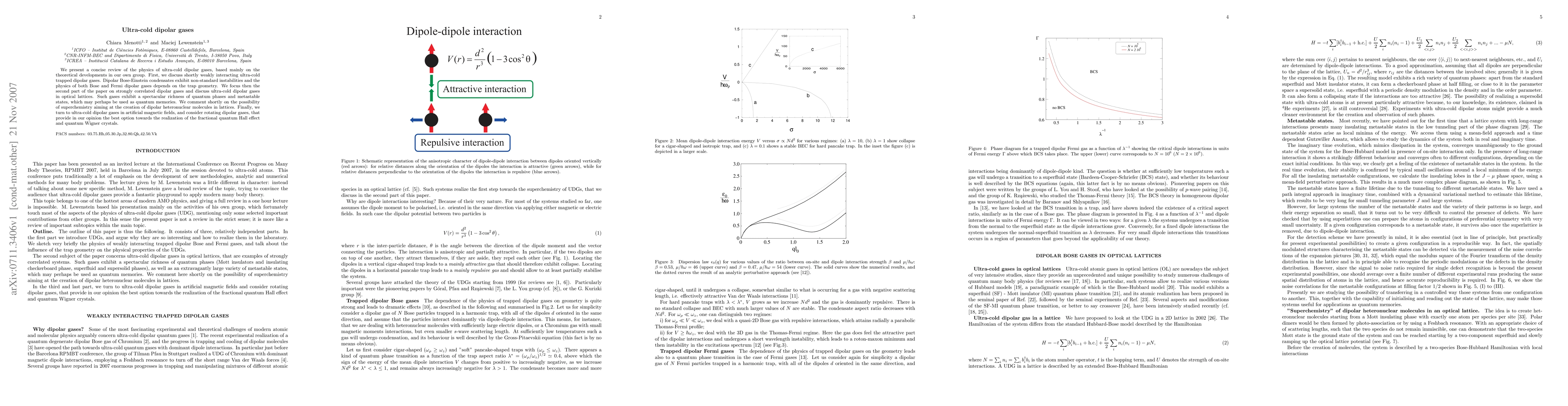 This paper reviews theoretical advancements in ultra-cold dipolar gases, focusing on weakly interacting trapped gases and their non-standard instabilities. It also explores strongly correlated dipolar gases in optical lattices, highlighting their potential for quantum memory and superchemistry, and discusses the possibility of achieving the fractional quantum Hall effect and quantum Wigner crystals in rotating dipolar gases.
