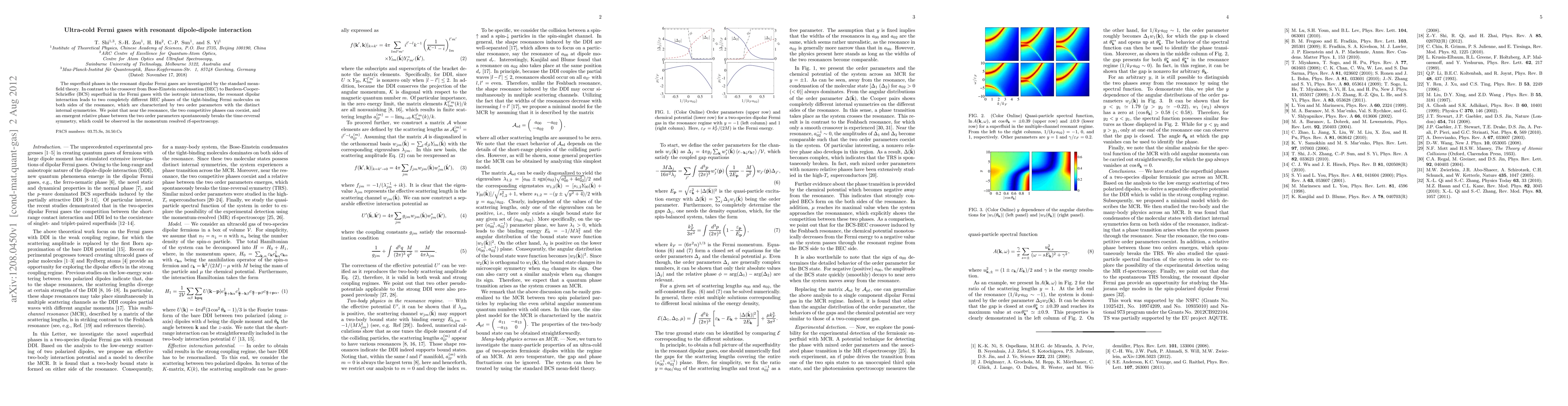 The superfluid phases in the resonant dipolar Fermi gases are investigated by the standard mean-field theory. In contrast to the crossover from Bose-Einstein condensation (BEC) to Bardeen-Cooper-Schrieffer (BCS) superfluid in the Fermi gases with the isotropic interactions, the resonant dipolar interaction leads to two completely different BEC phases of the tight-binding Fermi molecules on both sides of the resonance, which are characterized by two order parameters with the distinct internal symmetries. We point that near the resonance, the two competitive phases can coexist, and an emergent relative phase between the two order parameters spontaneously breaks the time-reversal symmetry, which could be observed in the momentum resolved rf-spectroscopy.