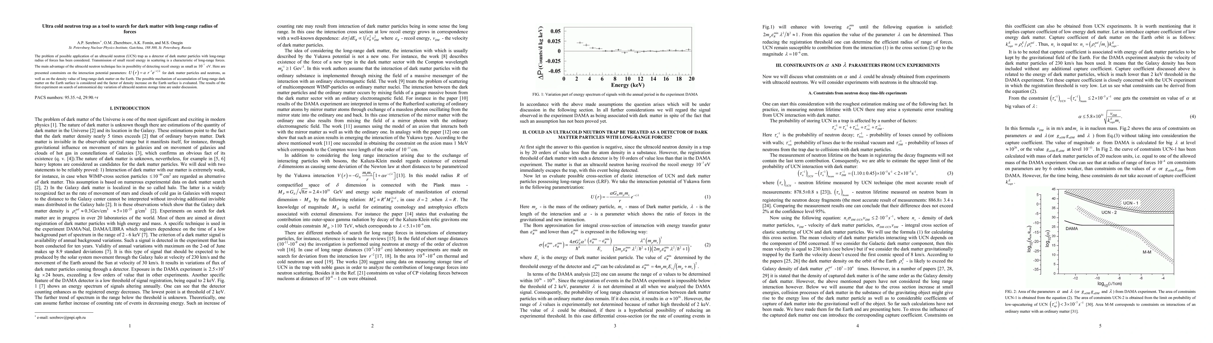 This paper explores the potential of ultracold neutron (UCN) traps to detect dark matter particles exhibiting long-range forces, highlighting the technique's ability to sense minute recoil energies. It presents constraints on interaction potential parameters and evaluates the density of such dark matter on Earth, discussing preliminary experimental results on UCN storage time variations.