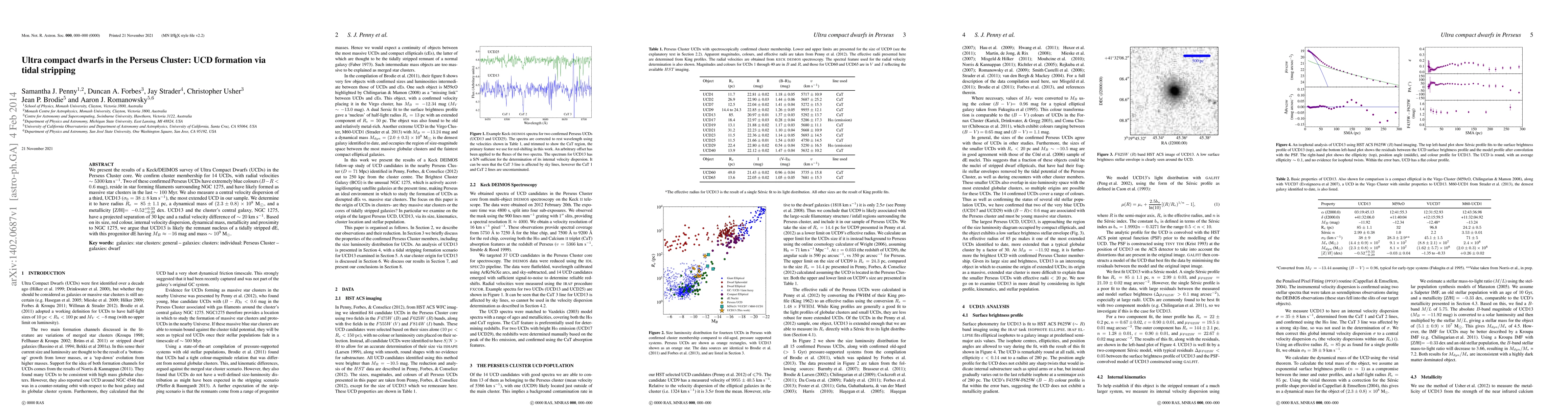 This study confirms the cluster membership of 14 Ultra Compact Dwarfs (UCDs) in the Perseus Cluster, revealing two blue UCDs likely formed recently from massive star clusters. The analysis of a particularly extended UCD, UCD13, suggests it is the remnant nucleus of a tidally stripped dwarf elliptical galaxy, based on its size, mass, and proximity to NGC 1275.