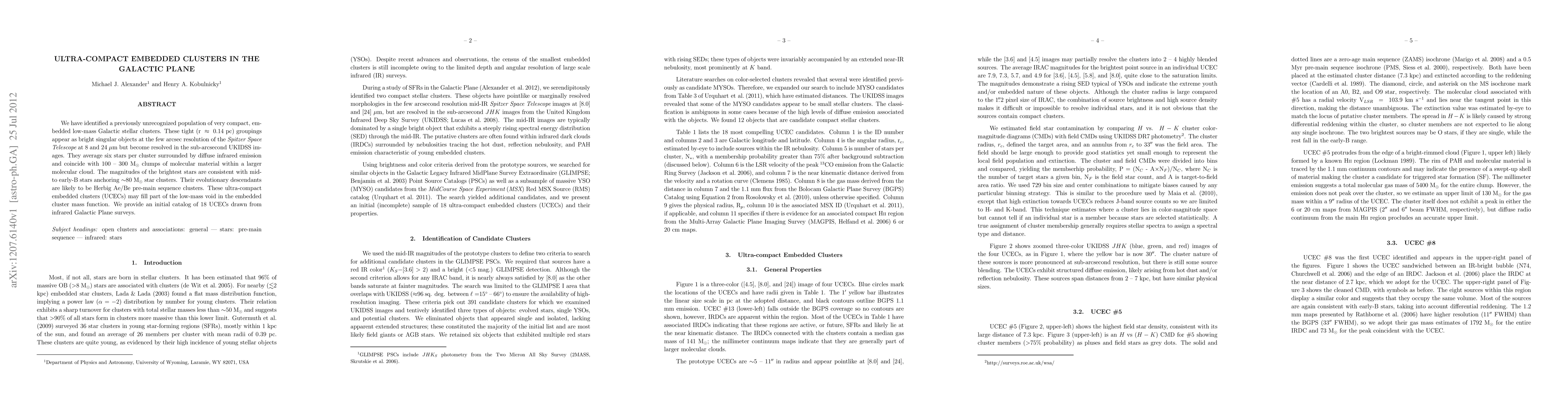 This paper identifies a new population of ultra-compact embedded clusters (UCECs) in the Galactic Plane, characterized by tight groupings of low-mass stars within molecular material. These clusters appear as bright objects in Spitzer Space Telescope images but are resolved in UKIDSS sub-arcsecond images, suggesting they may fill a low-mass gap in the embedded cluster mass function.