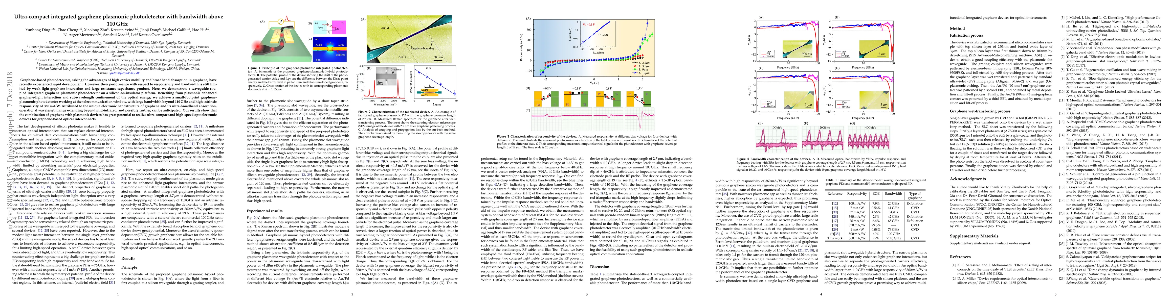 This paper introduces an ultra-compact graphene plasmonic photodetector on a silicon-on-insulator platform, achieving a bandwidth exceeding 110GHz and an intrinsic responsivity of 360mA/W, thanks to enhanced graphene-light interactions and optical energy confinement. The device's potential extends its operational wavelength range into the mid-infrared and beyond, showcasing the promise of graphene-plasmonic integration for high-speed optoelectronics.