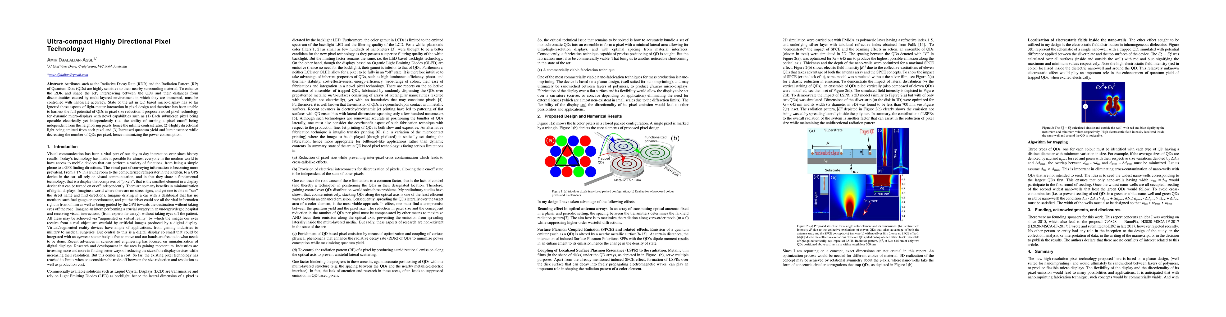 Attributes such as the Radiative Decay Rate (RDR) and the Radiation Pattern (RP) of Quantum Dots (QDs) are highly sensitive to their nearby surrounding material. To enhance the RDR and shape the RP, interspacing between the QDs and their distances from discontinuities caused by multi-layered environment in which they are immersed, must be controlled with nanoscale accuracy. State of the art in QD based micro-display has so far ignored these aspects of light-matter interaction in pixel design and therefore has been unable to harness the full potential of QDs in pixel size reduction. I propose a novel pixel technology for dynamic micro-displays with novel capabilities such as (1) Each submicron pixel being operable electrically yet independently (i.e. the ability of turning a pixel on/off being independent from the neighboring pixels, hence the infinite contrast ratio. (2) Highly directional light being emitted from each pixel and (3) Increased quantum yield and luminescence while decreasing the number of QDs per pixel, hence minimizing the power consumption