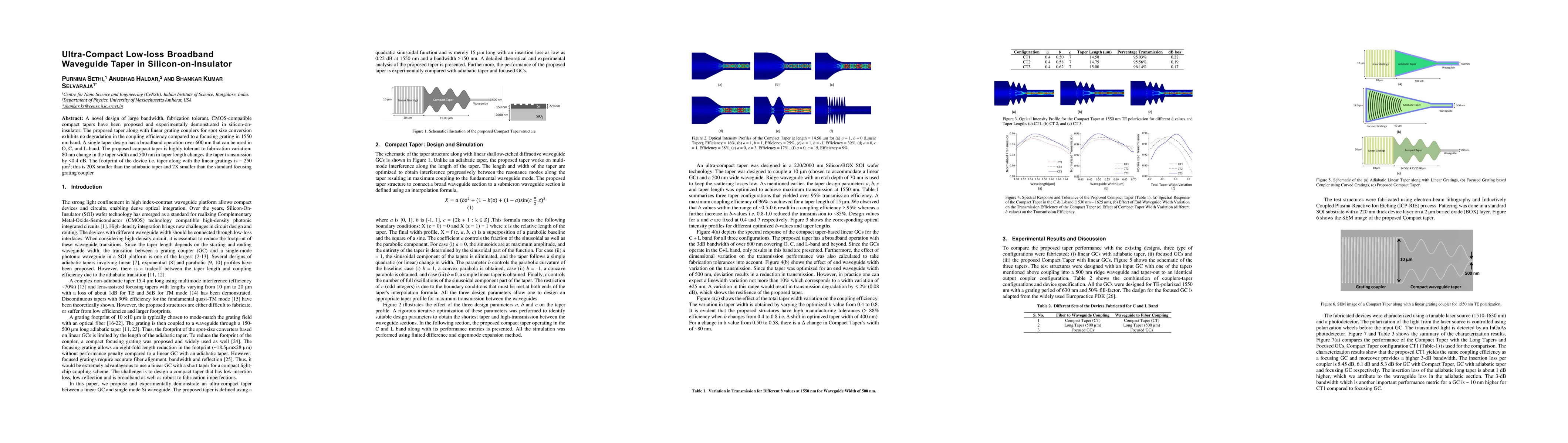 This research proposes a novel ultra-compact, low-loss broadband waveguide taper in silicon-on-insulator, demonstrating a footprint 20X smaller than adiabatic tapers and 2X smaller than focusing grating couplers, with high tolerance to fabrication variations and no degradation in coupling efficiency.